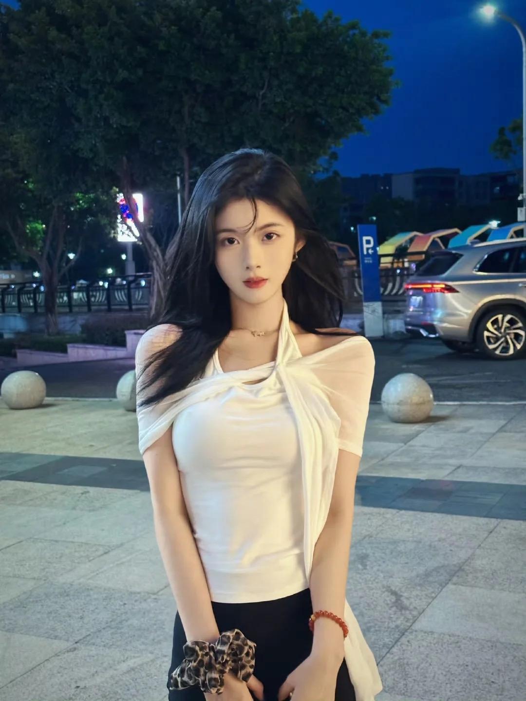 《夜街遇佳人》 晚街灯晕浸风柔,素袂轻垂露半裘。 云鬓斜簪星欲落,一城喧寂入明眸。 《晚风里的甜》 夜色揉进晚风中 街灯漫过她的肩 白衫轻垂的褶皱里 藏着星子没说完的甜 发梢掠过时 城市的喧嚣都软了 像这晚的风 只轻轻碰了碰人间 原创看图片配诗 原创美人诗 美诗词夜景 看图出两句诗