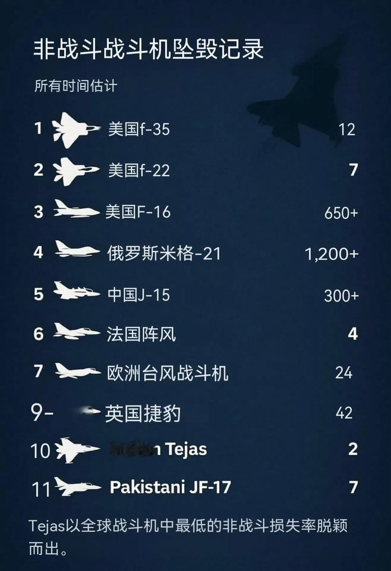 三哥真有才,巴拉特赢学更是横亘古今未逢敌手! 为了找补在全世界面前损失一架战机的尴尬局面,有才的三哥马上给出一副榜单——战斗机非战斗坠毁数量排名,三哥自家光辉战机以损失2架的“成绩”成为榜单最佳。 真是服了三哥的脑回路了,不管怎样都能想办法赢回来,思路清奇无人出其右。 什么?连咱家的歼15都掉了这么多?!怎么我都不知道啊,三哥编数据的时候难道都不查一下我们又这么多的歼15吗?嗨,只要无底线的编怎么都能赢。