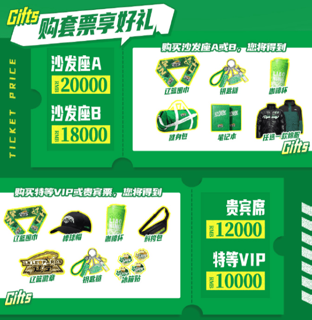 其中:沙发座A主场套票价格为20000,贵宾席为12000,乙票为1000。