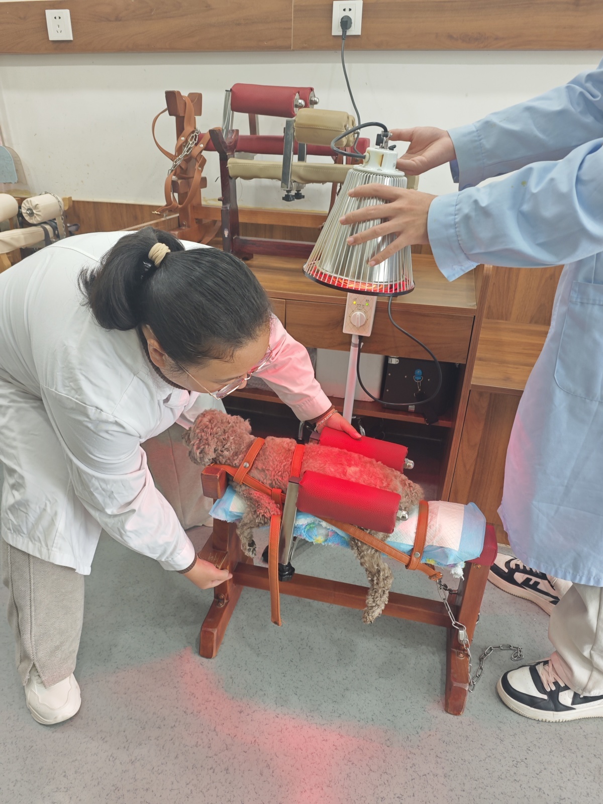 推开中医馆的门,没有消毒水的刺鼻气味,反而飘着一股淡淡的艾草香,瞬间让人紧绷的神经放松下来。治疗区里,病号“可乐”正趴在一个奇怪的木制架子上:架子铺着柔软的垫子,四条腿被浅色皮质绑带轻轻固定着,看起来像个专属诊疗座。它眼神比刚来时亮了不少,只是偶尔转动脖子时,还是会忍不住哆嗦身子,那是颈椎骨质增生带来的旧痛。