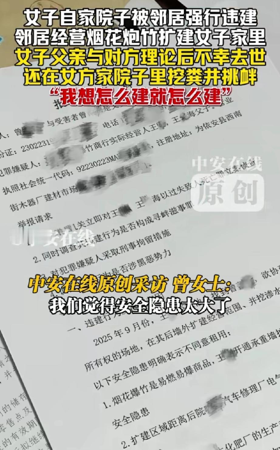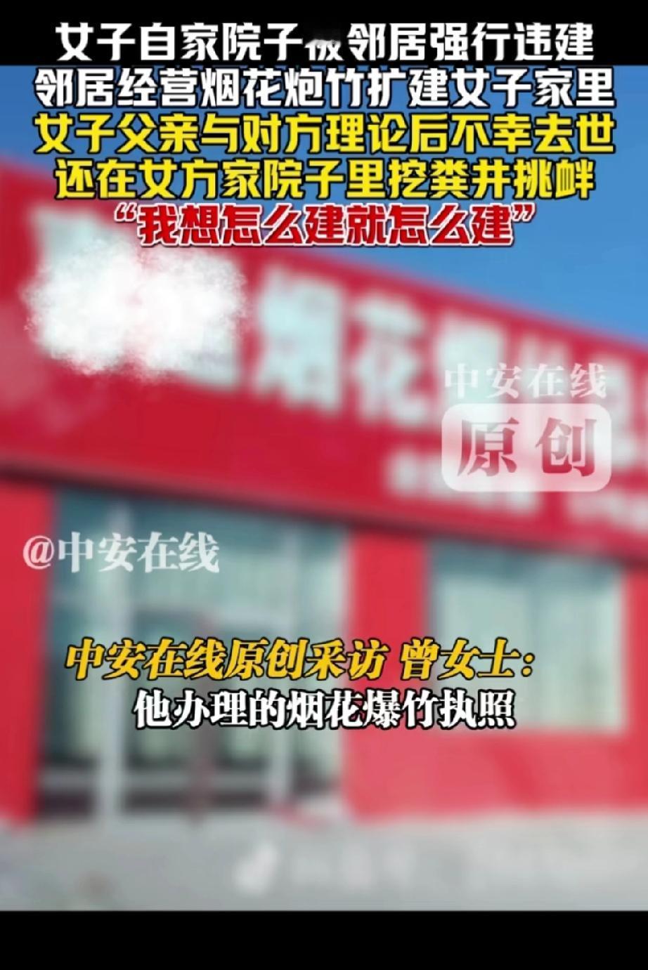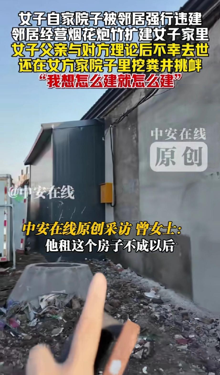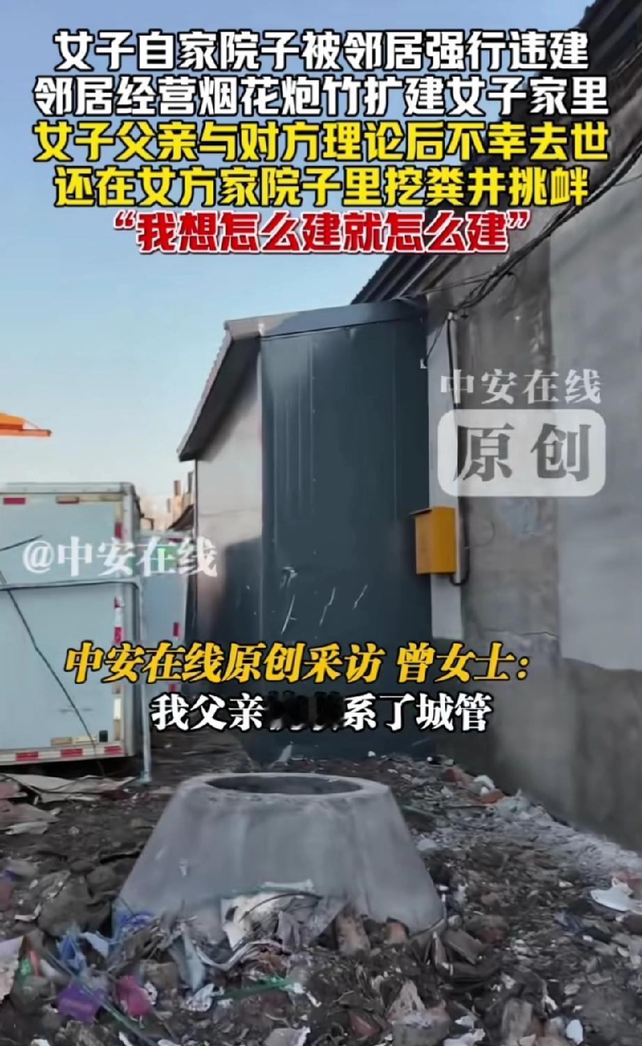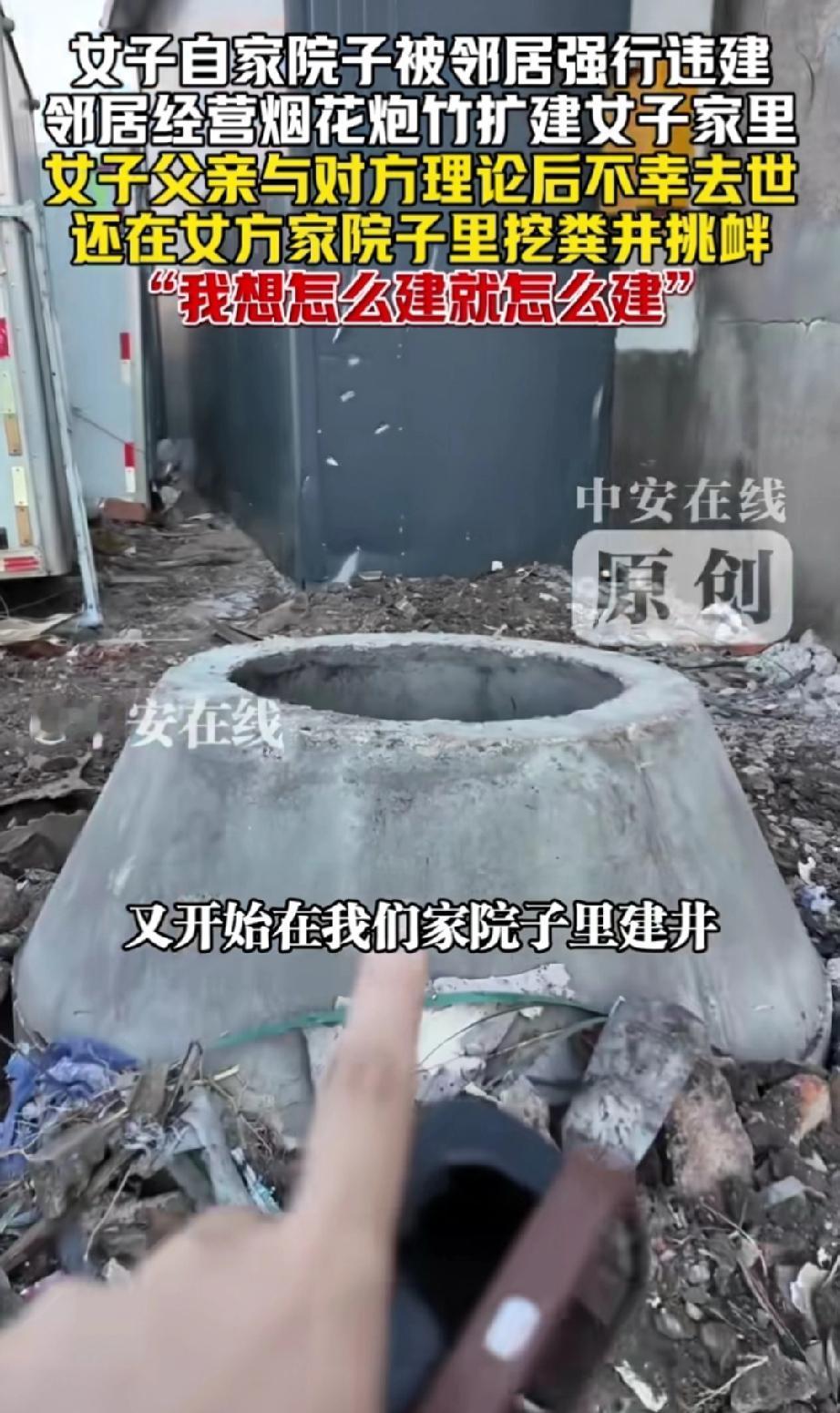 黑龙江,隔壁邻居今年五月份买了房子,并开始在家中售卖烟花炮竹。邻居想租女子家的房子,遭拒后竟将房屋扩建至女子家的院子里。女子父亲发现后报了城管,城管赶来制止了邻居施工。 实际上,女子父亲一直反对邻居在自家隔壁卖烟花爆竹,认为这样存在极大的安全隐患。 城管离开后,邻居又偷偷开始违建。女子父亲发现后与邻居发生争吵,回到屋内便因心梗发作不幸离世。 不久后,女子回到家中,惊讶地看到邻居不仅完成了扩建,还在自家院子里挖了一口排粪井。 从女子的讲述可知,她家这处房子并非经常有人居住,或许正因如此,邻居才有机可乘,继续违建并挖粪井。 目前,警方仍在调查女子父亲的去世原因。 邻居的行为太过嚣张,更是一种坏,是谁给他的胆子? 难道是想欺负人?是因为女子远嫁且是独生女吗? 若警方证实女子父亲的死亡与那次争吵有关,建议女子起诉邻居,争取获得经济赔偿。 此外,有卖烟花爆竹的执照,就可以在居民区随意开店?这难道不存在安全隐患?女子父亲的担忧很有道理。 邻居又在女子家院子里挖粪井,是想报复?还是为了自己方便?或就是想白占女子家的房子。 院子里有邻居家的粪井,女子家的房子没人敢买了,更是无法居住。 而且,往别人家院子扩建、挖粪井属于侵占他人财产的行为,粪井还有侮辱之意,这就不只是向城管举报的事了,必须向警方报案。 来源:中安在线