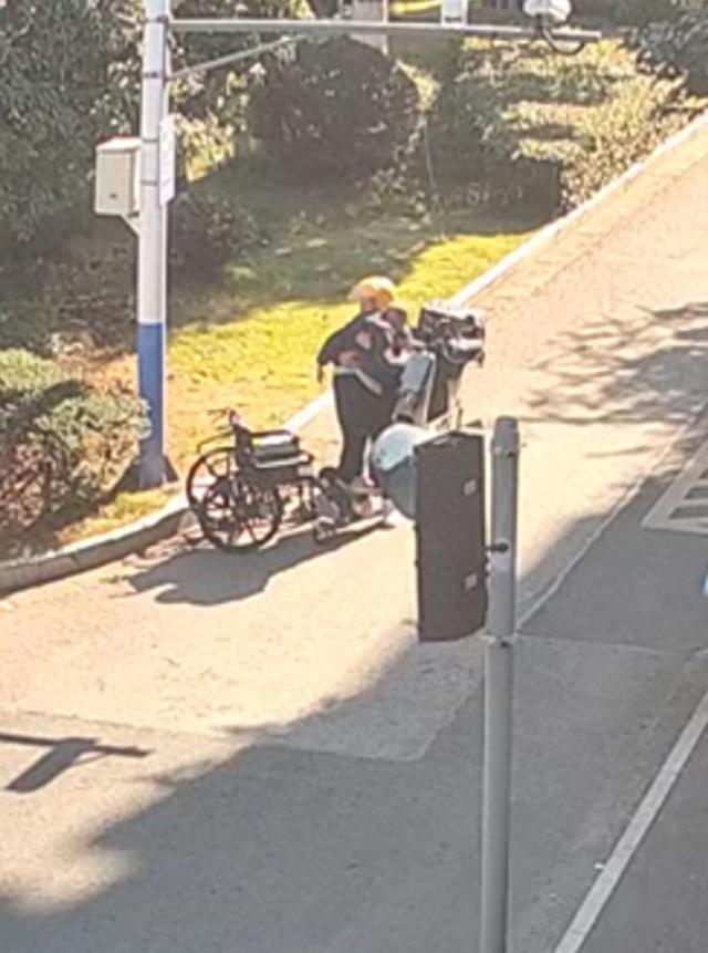一段事发地的监控视频显示,老人之前自己推着轮椅在路上行走,似乎有些累了,便坐在路边石板上,可能坐的位置太低,难以起身。王军来到老人身边后,将老人抱起来放在轮椅,还细心地调整好脚踏,随后将老人推到路边安全的位置。