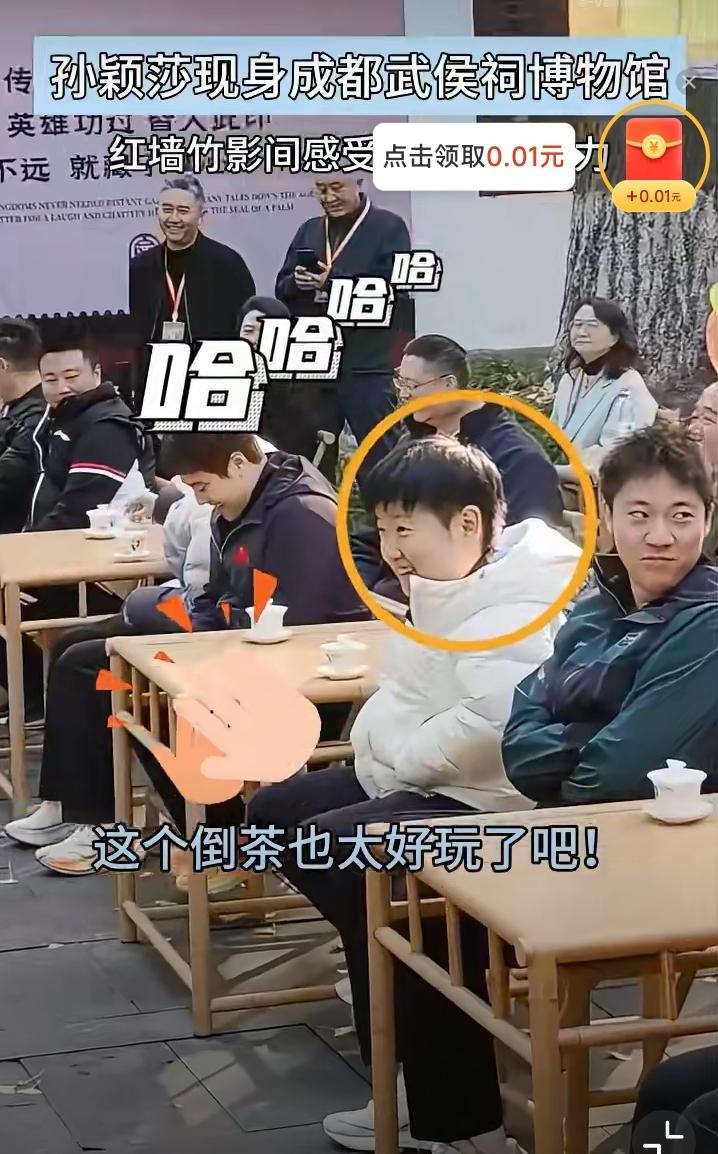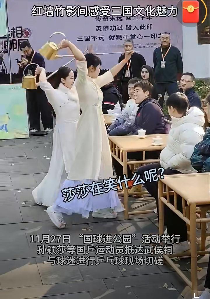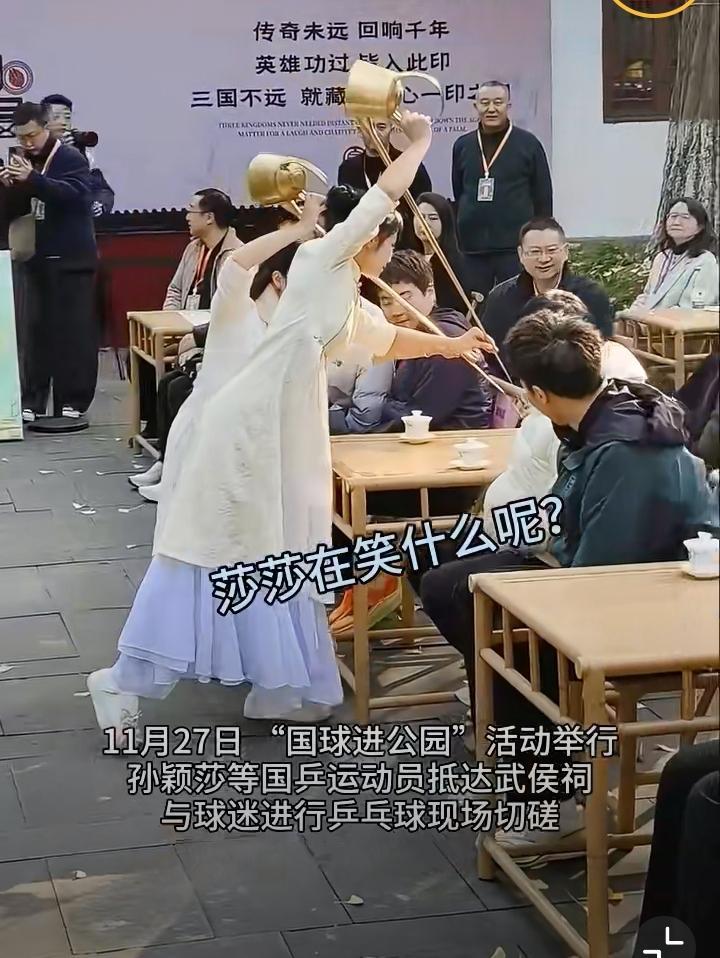 今天莎莎去武侯祠啦[笑哭], 今天在成都备战2025成都混团世界杯的孙颖莎、梁靖崑、袁励岑、全开源参加“国球进社区”活动,他们一起来到了成都武侯祠,体验成都古文化传承。 体验中,莎莎眼睛紧盯着倒茶的两个女孩子,开心地欣赏着她们的表演,天天训练的孩子终于可以休息一下了[笑哭]。 而王楚钦和王艺迪,王曼昱、林诗栋和陈熠等也分头来到了武侯区的其他社区,与球迷一起打球互动,场面一个比一个热闹,曼昱还得到了一名剪纸艺人给她当场剪的头部侧影[赞]。 今天孩子们就当来旅游了,好好开心一下吧[笑哭]。
