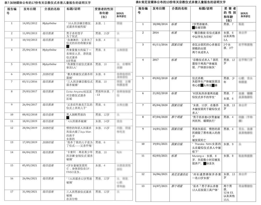 而根据独立研究员EmmanuelSarpongOwusu的研究报告,在2012年至2021年间,加纳至少发生了160起仪式性谋杀案,其中94名受害者为儿童。同期,肯尼亚共发生了102起仪式性谋杀,其中66位受害者为儿童。