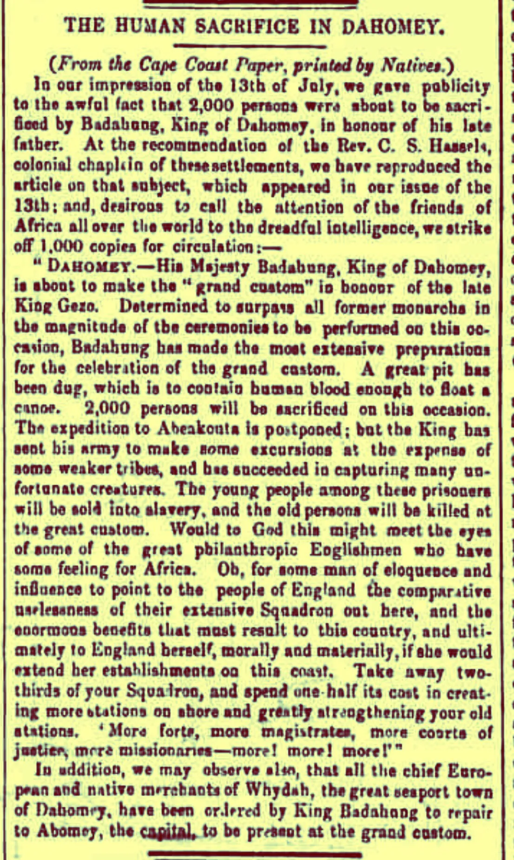 1860年,海岸角报报道了达荷美王国的大规模人祭,报道声称有2000人被人祭。