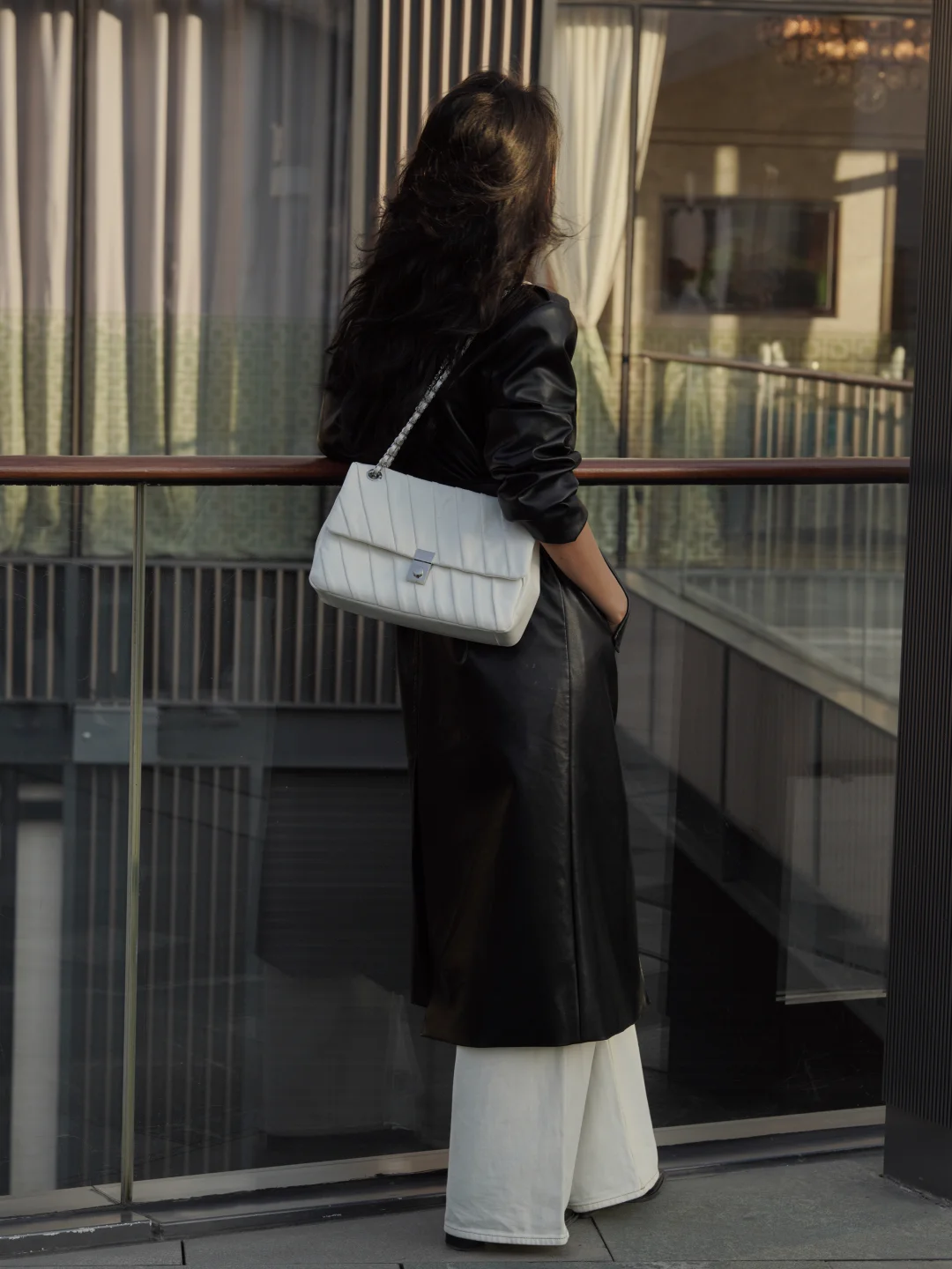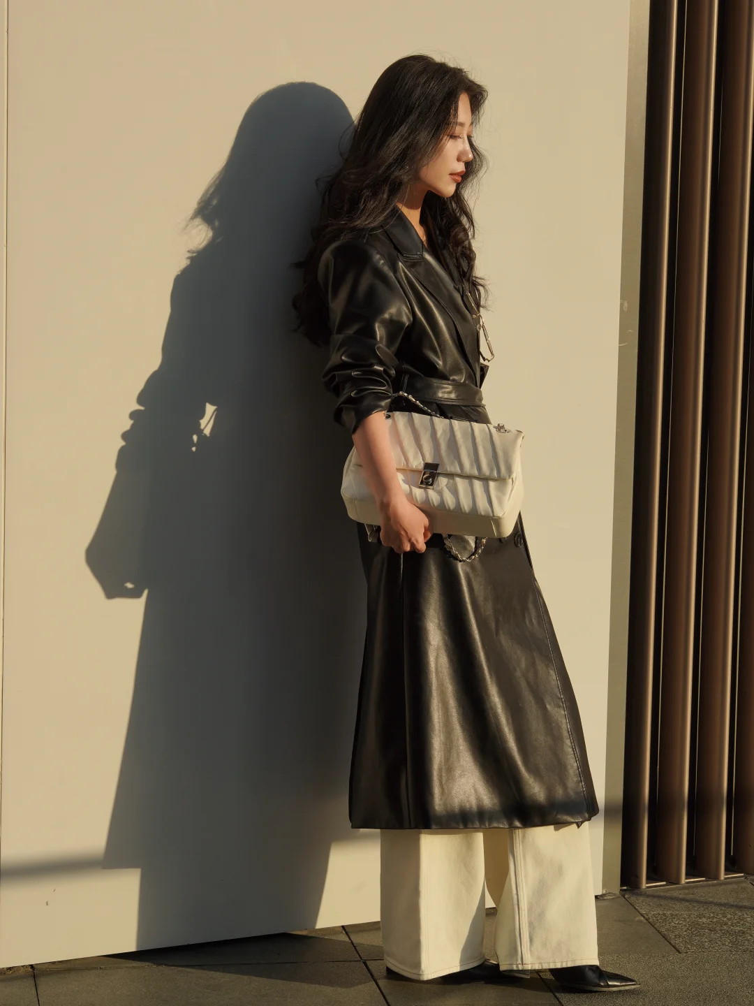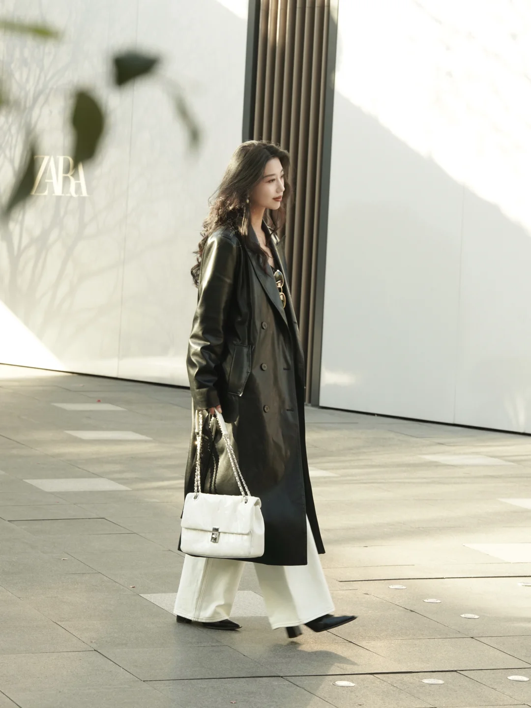 白,是初雪般的纯粹;黑,是暗夜里的沉静。 当皮质与链条在黑白之间相遇,不是对立,是对话。 柔软的皮质,承载日常的从容; 冷冽的链条,勾勒线条的利落。 它们碰撞,却不冲突—— 像白天与黑夜交替,自然成序。 不过分乖巧,不刻意张扬。 这只包懂得沉默的力量。 斜挎,是轻松的休闲,单肩,是随性的时髦。 从昼到夜,它陪我走过城市街角, 融入每一帧不经意的画面。 经典,从未如此自由。 黑白之间,是自我定义的风度。