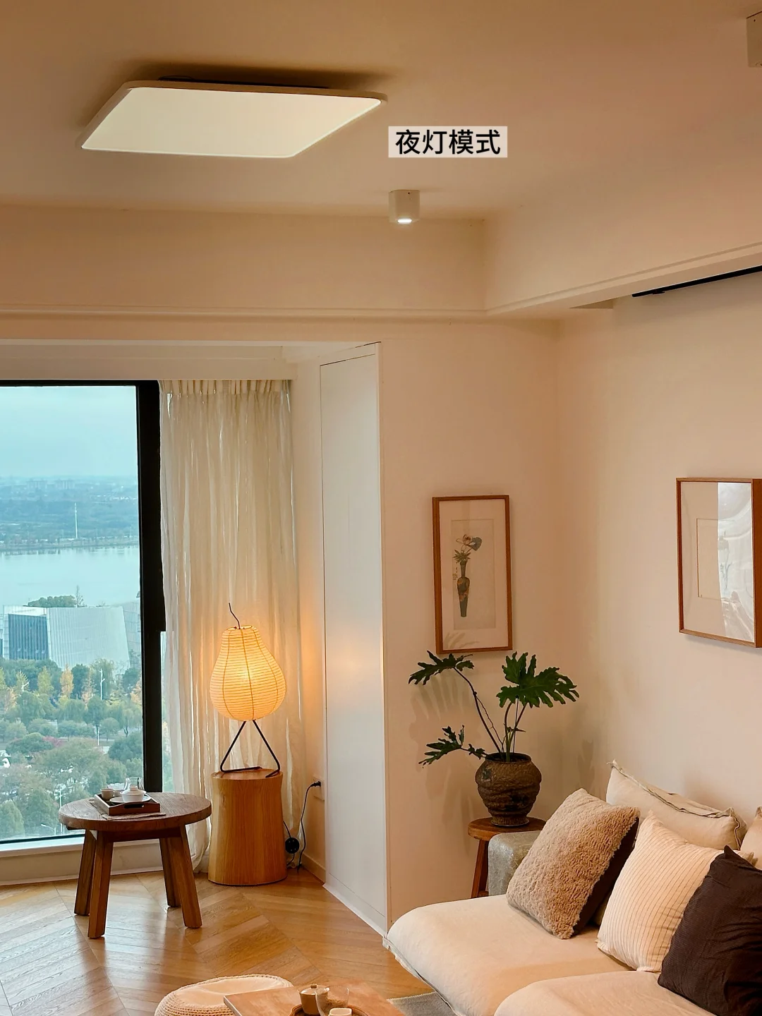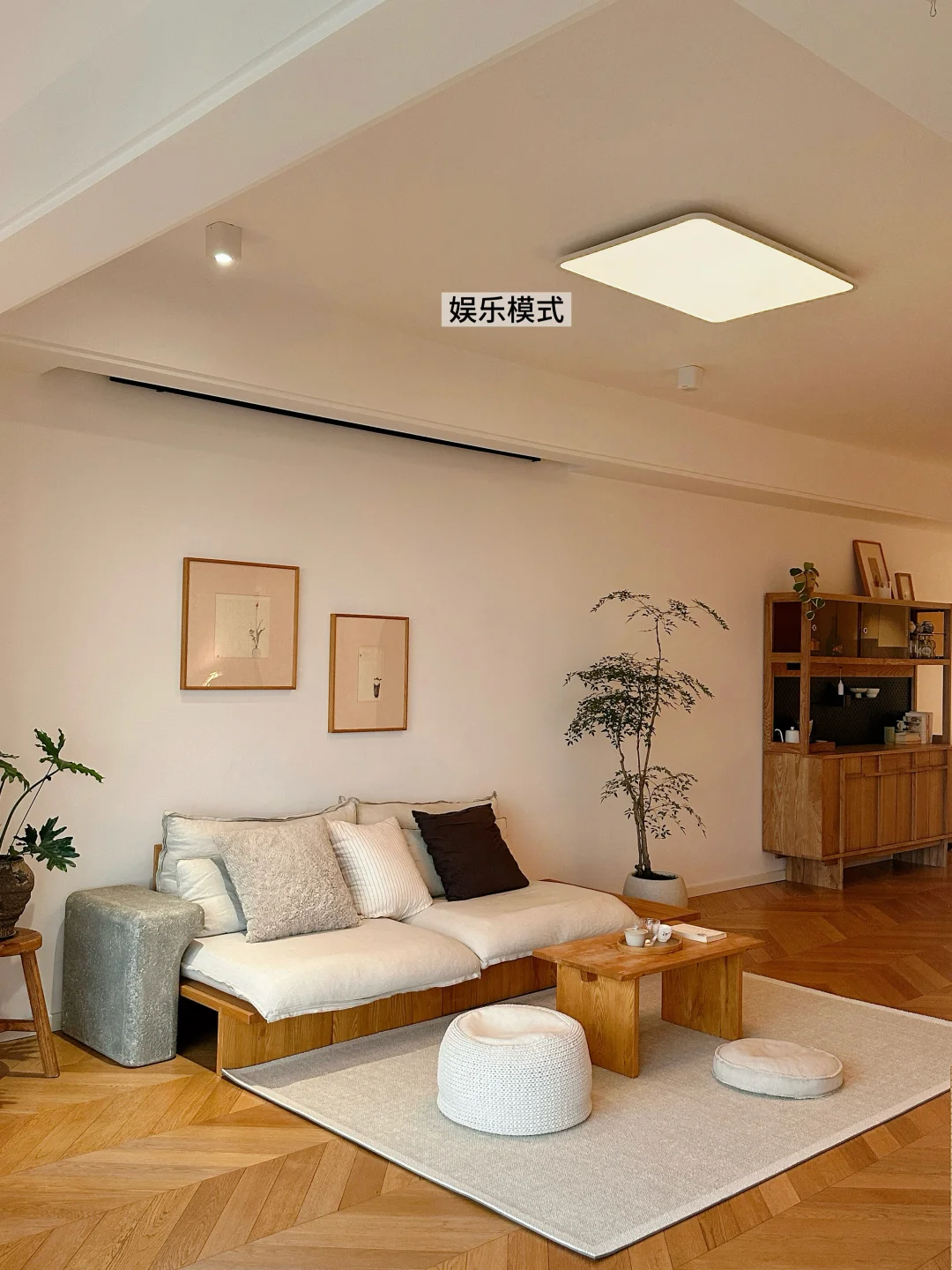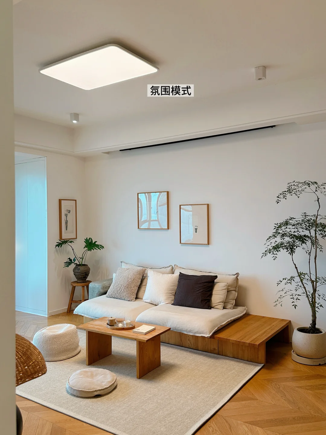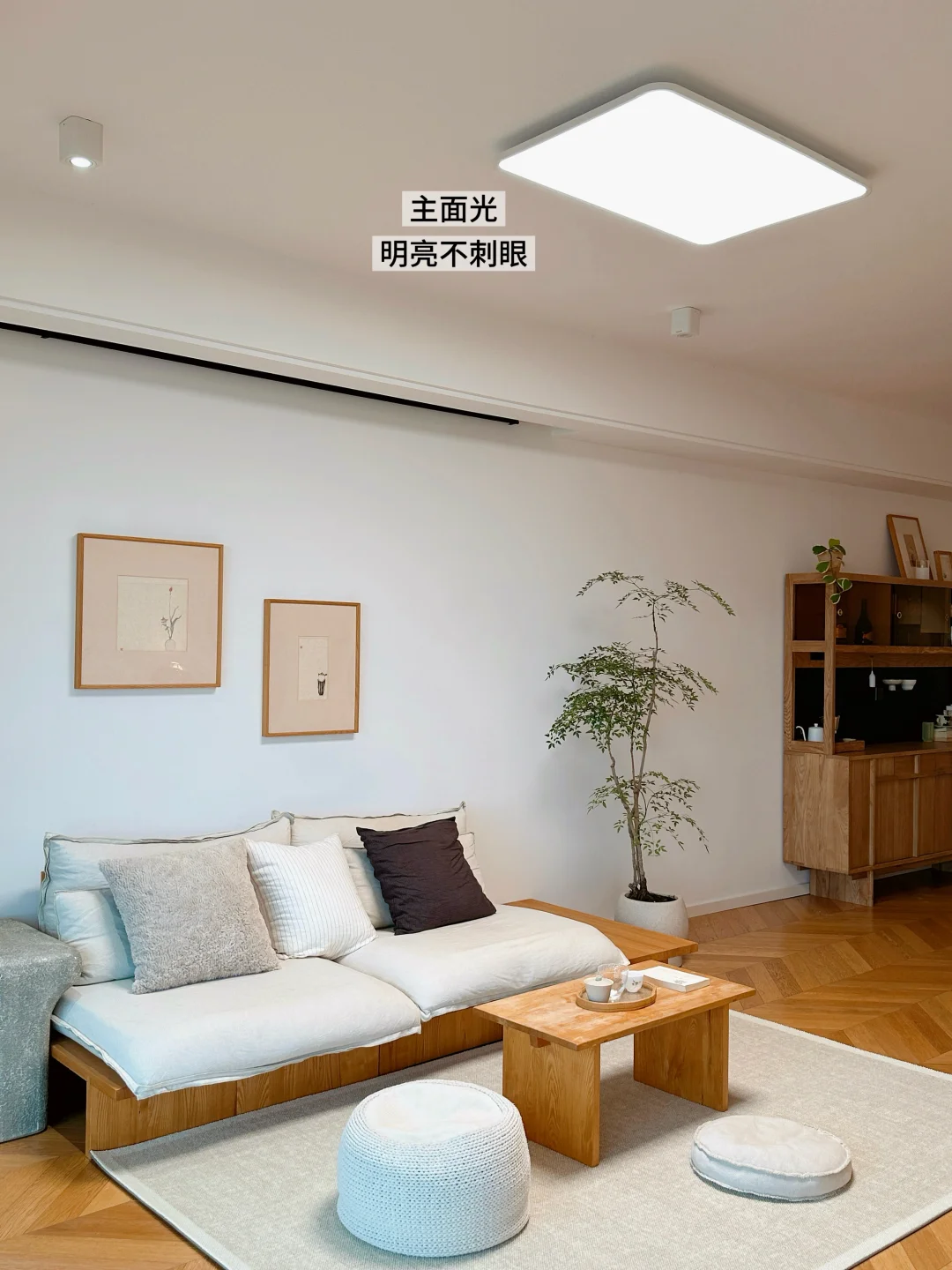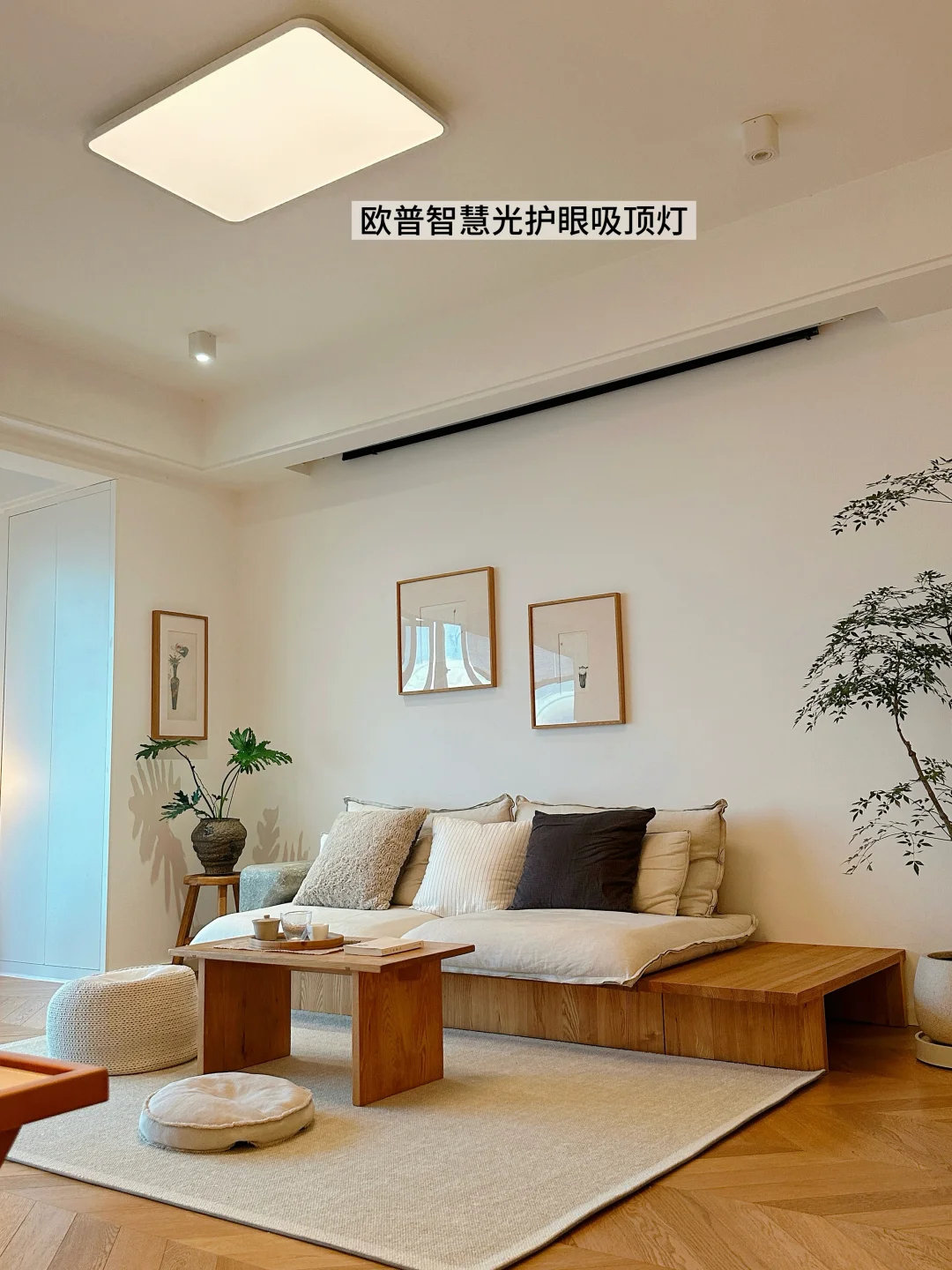装修时就认准极简原木风,不做复杂吊顶、省略厚重电视背景墙,只靠浅原木色地板,再加上清爽柔软的羊毛地毯,主打一个通透治愈,不堆砌、不压抑,让小空间满是呼吸感。选灯时更是不敢马虎,既要贴合木系温润调性不破坏整体质感,又得兼顾日常护眼实用,挑来挑去还是锁定欧普—29年专业照明品牌,风格适配和护眼设计都戳中需求!👏 它的颜值真的长在我的心巴上!超薄机身完全不占空间,也不会让没吊顶的天花板显得光秃秃的,反而像一层温柔的“光影装饰”,和家里的实木地板、木质感家具无缝衔接,和谐到像本来就该在这里。 ✅光线更是把专业和舒适拉满,还藏着实打实的硬实力!联合武大教授定制的全光谱,像清晨透过木质纱帘的自然光,加上Ra97高显色指数,搭配它提升了色彩舒适度、色彩分辦度,色彩还原度三大重要指标,木桌的天然纹理更清晰有质感,绿植的鲜绿也更鲜活透亮,白天开灯不刺眼、和自然光无缝衔接,晚上亮灯不昏暗,家里每一处木色都更显温润,视觉上特别舒服。而且还获得南德TÜV 多项认证,无可视频闪、RG0无蓝光危害,窝在沙发看书、追一下午剧,眼睛都不发酸,宅家一整天也轻松,这就是专业品牌的护眼底气。 作为不爱动弹的宅家星人,APP控制真的太香了!躺着就能切换6种模式:看书时开主面光,明亮不压抑;独处时调氛围光,木色空间更显静谧;深夜起夜开夜灯,微弱光线刚好照亮路,完全不打扰休息。每种模式都和原木风的温柔感适配,没有一点违和感。🍺 🛋️现在每天下班推开家门,暖融融的灯光洒在木色家具上,没有复杂装饰的堆砌,小空间显得格外开阔通透。原来没吊顶、没电视背景墙的原木风小家,不用刻意“扩容”,选对一盏懂风格、懂需求的灯,就能让宅家时光更惬意,木系小空间也能有满满的呼吸感~