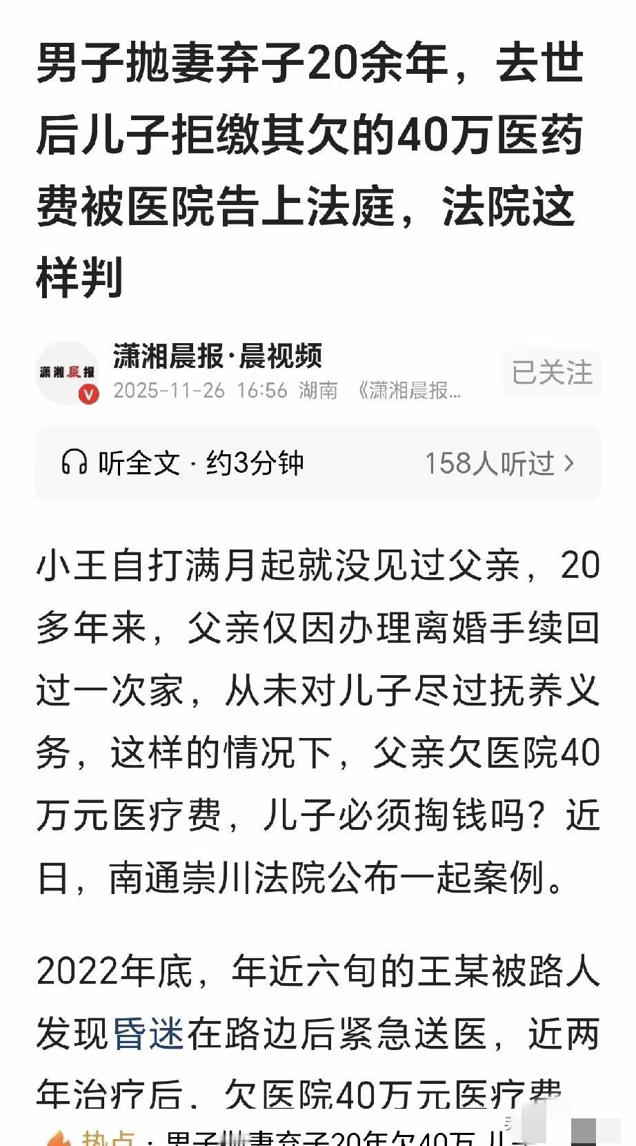 这哪是“父债子偿”? 分明是因果报应! 江苏南通一男子孩子刚满月就抛妻弃子,逍遥20多年不管不顾,老了病倒欠40万医疗费,竟想让从未养过的儿子买单,真够荒唐的! 法律从不是纵容自私的工具,《民法典》早说透了:继承人只在遗产范围内还债,放弃继承就不用担责。他生而不养,没尽过一天父亲的义务,凭什么老了要儿子兜底? 小王拒绝缴费合情合理,法院驳回医院额外诉求也彰显公平——亲情是相互的,你对孩子不管不顾,就别指望老了能坐享其成。 父母子女间的责任从来双向奔赴,不是单方面索取。你觉得小王的做法没毛病,还是该网开一面?