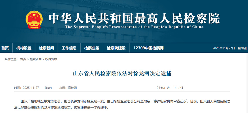 最高检11月27日消息,山东广播电视台原党委委员、副台长徐龙河涉嫌受贿一案,由山东省监察委员会调查终结,移送检察机关审查起诉。日前,山东省人民检察院依法以涉嫌受贿罪对徐龙河作出逮捕决定。该案正在进一步办理中。