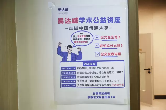 11月26日下午,易达威学术公益讲座再次走进中国传媒大学,这也是我们继上个月在该校举办首场讲座后的第二次相约。由于上一场活动在学生中反响热烈,不少同学一直关注着讲座的后续安排,对论文写作与发表充满好奇与期待。本次讲座以“学术知识分享,为科研之路提质增效”为核心理念,在中国传媒大学学术报告厅顺利开展,现场座无虚席,学术氛围浓厚。此次中国传媒大学站的讲座,也是易达威学术公益系列活动的第八场。
