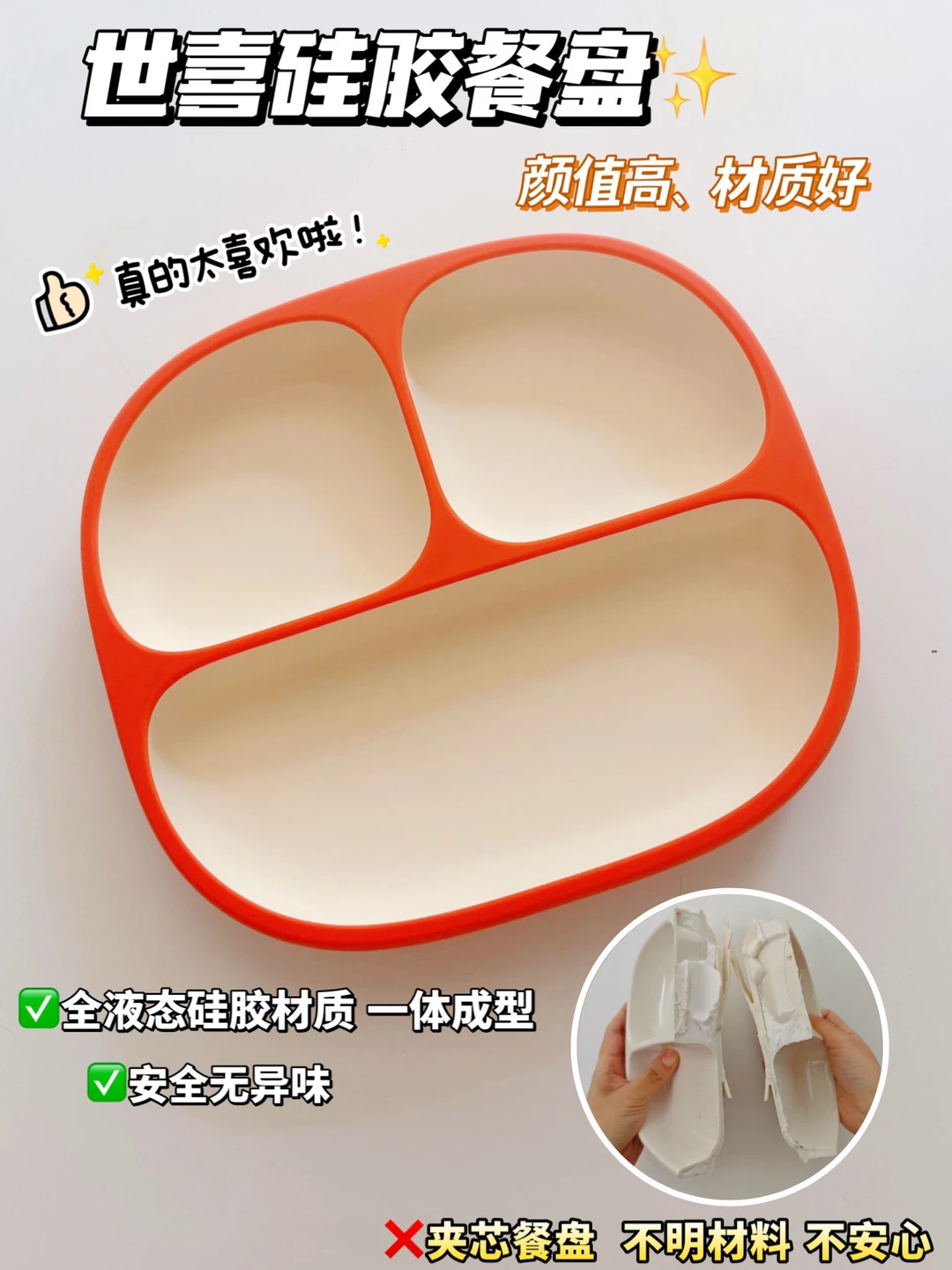 做功课很久入手了世喜液态硅胶餐盘,餐盘的材质用的是和世喜奶嘴一样的!全液态硅胶一体成型的,安全没有异味~ 女儿很喜欢,吃饭都积极了,还是我喜欢的分格设计,容量大,还不串味,颜色鲜艳看起来就很有食欲~吸盘吸力大,非常牢固,宝宝不容易打翻!