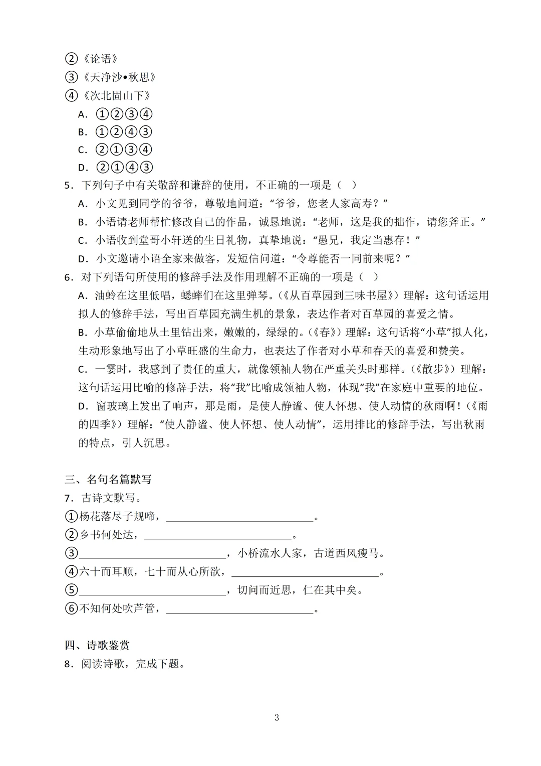 基础板块、古诗词默写和赏析、文言文阅读、阅读理解和作文,每个板块都是基础难度。像近 3 年真题里高频出现的 “贮蓄”“吝啬” 等易混字音字形、《闻王昌龄左迁龙标遥有此寄》《论语》十二章等必考默写句,都在里面,帮娃把基础分稳稳抓牢!