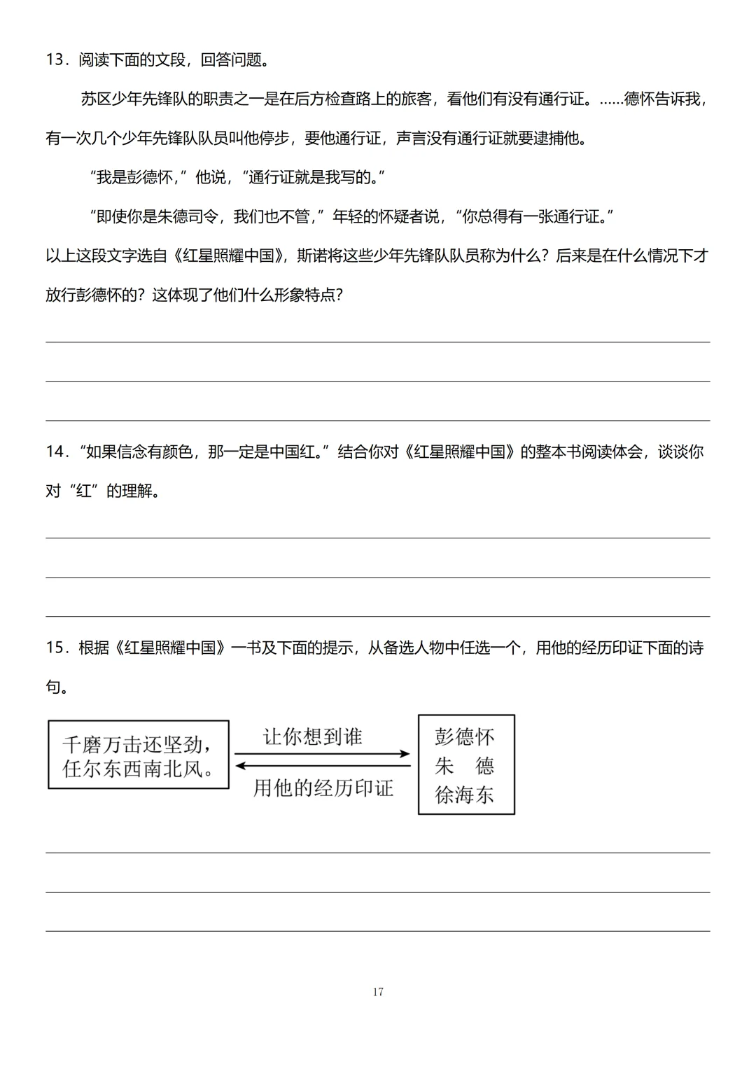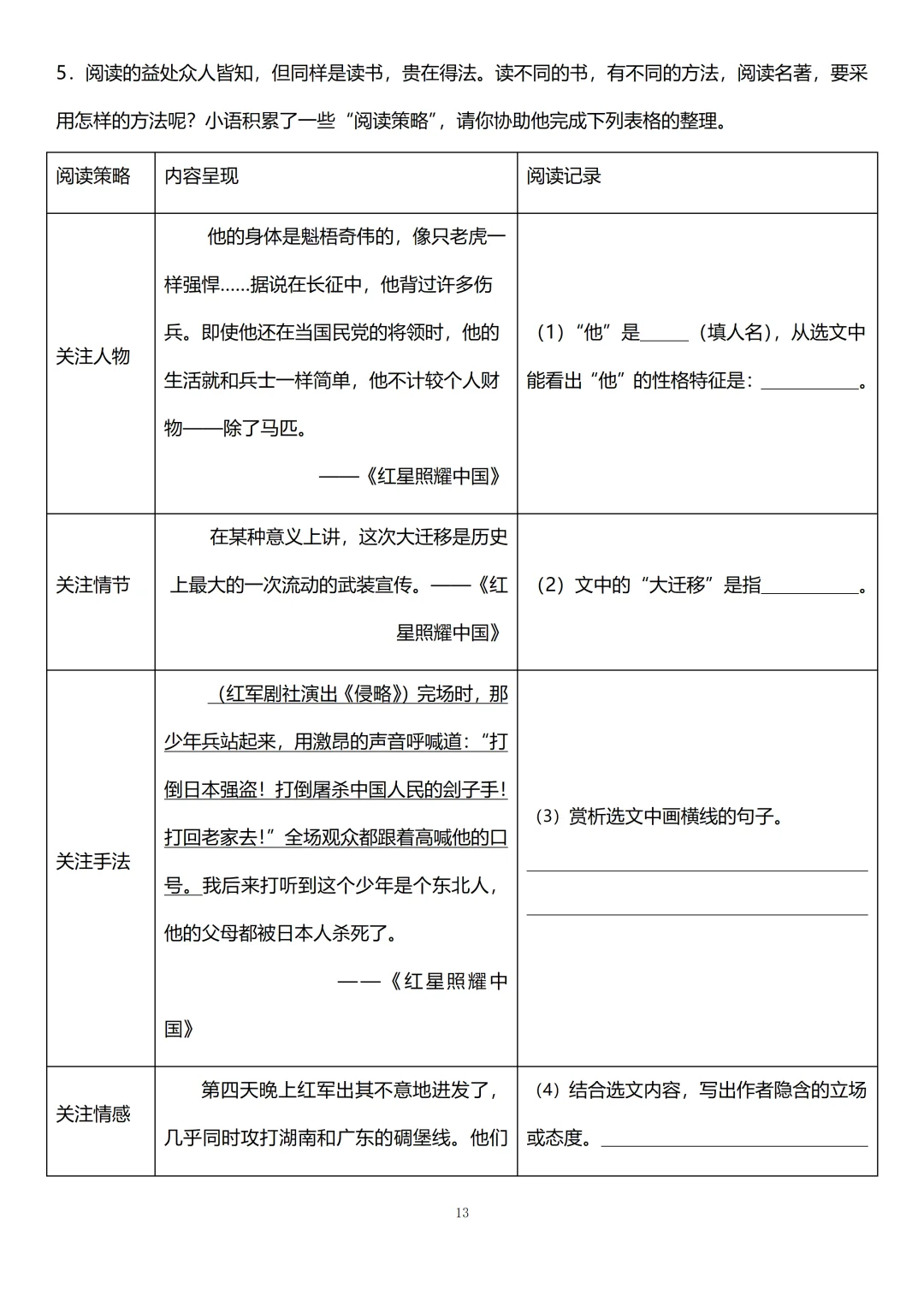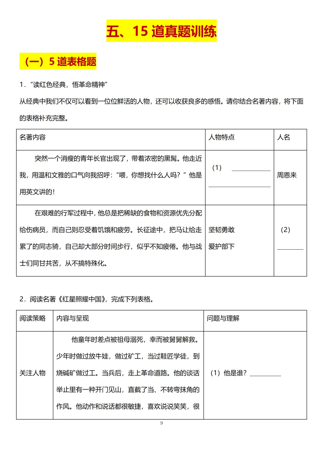 为了帮助大家提高期中考试名著板块的分数,老师精选了近 3 年各地期中考试的15道名著真题,包括5道高频表格题和10道问答题,提前练好,无论考试考到哪种类型都不用慌。 做完对照答案批改,错了的地方要回翻知识点梳理和原著,找到出处并重点记忆。