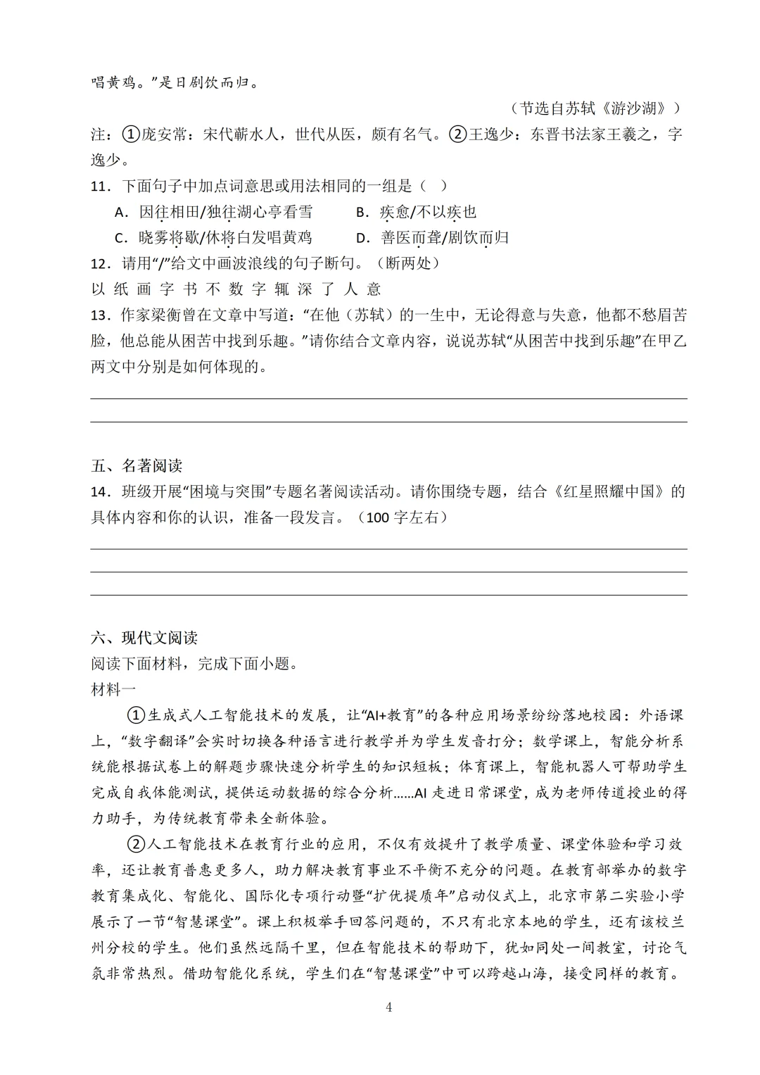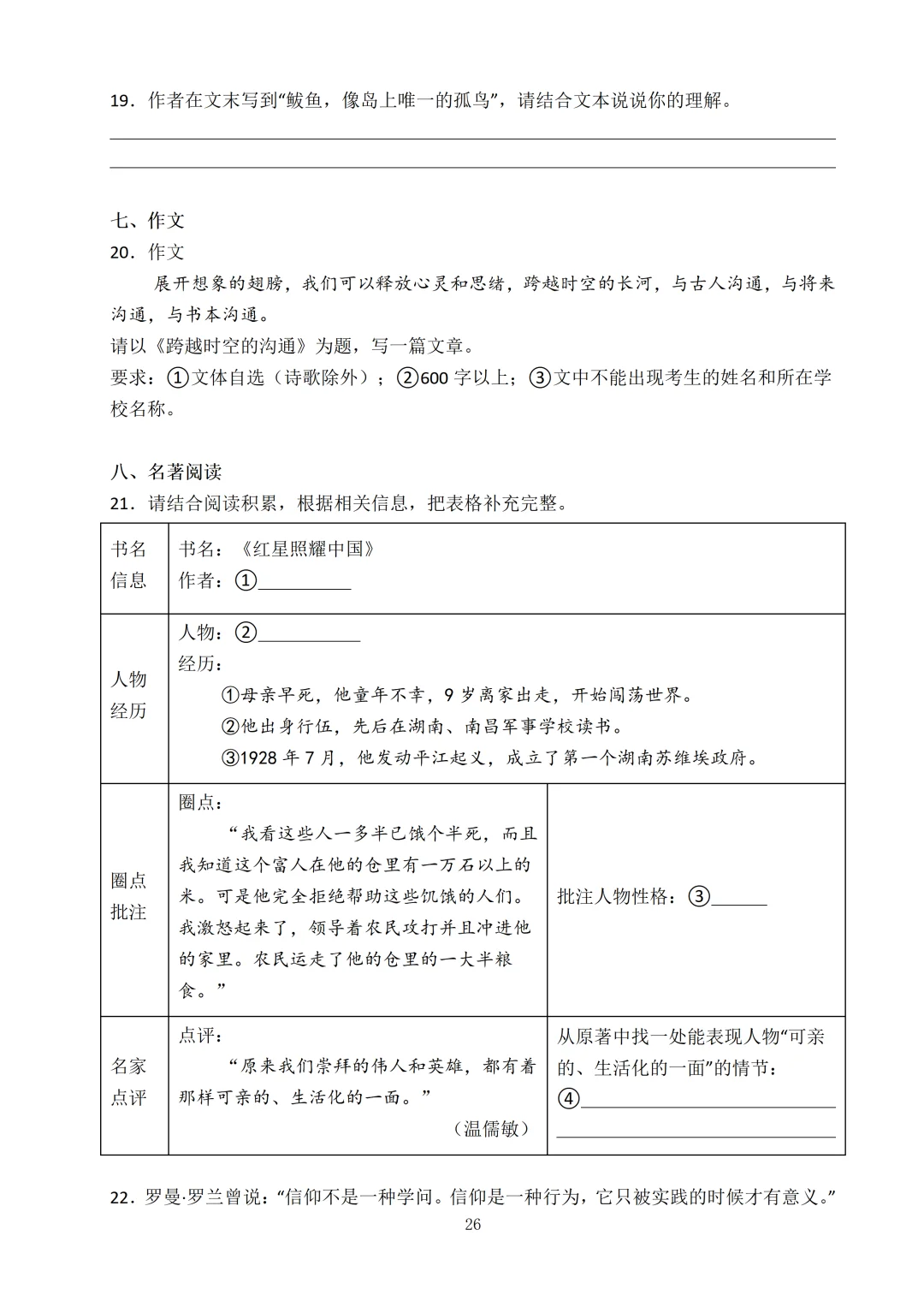 语言表达题型会考得更新颖,漫画题要理解漫画寓意。阅读理解考察的文体和类型更丰富,也更贴合课本单元类文,要掌握新闻类文体和人物传记类阅读的技巧。诗歌鉴赏和文言文考察课外,需要准确把握意思和主旨。名著板块考得更细致,例如给你情节要你写出长征途中的对应事件。作文考查材料作文,要求结合材料把握作文立意。提前适应高难度,考试时才能更稳!