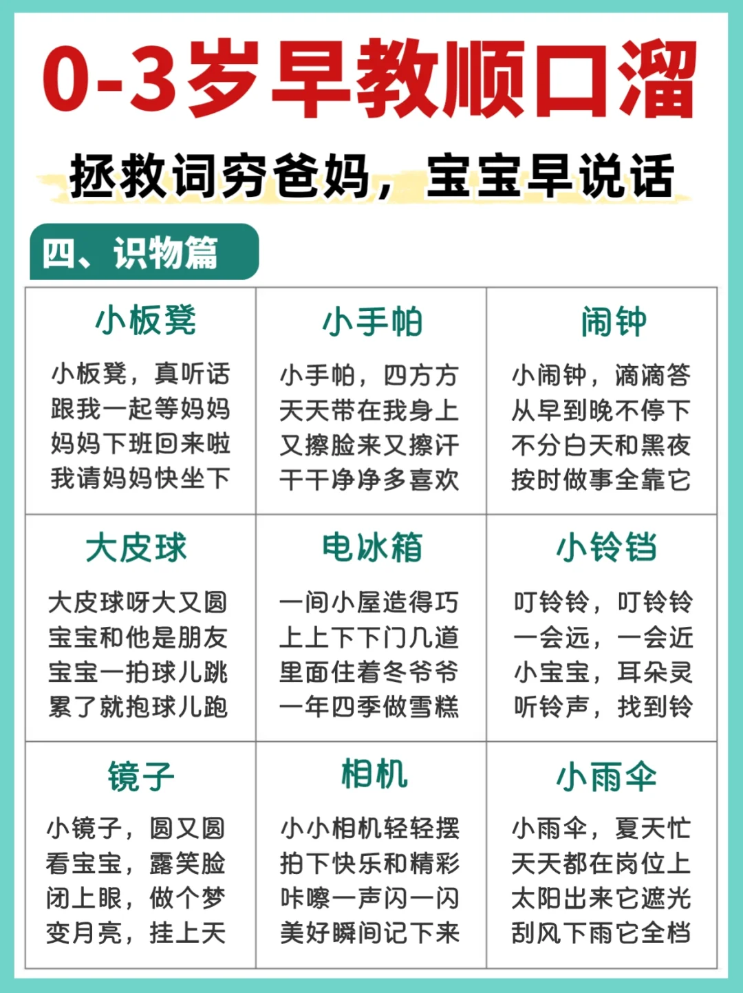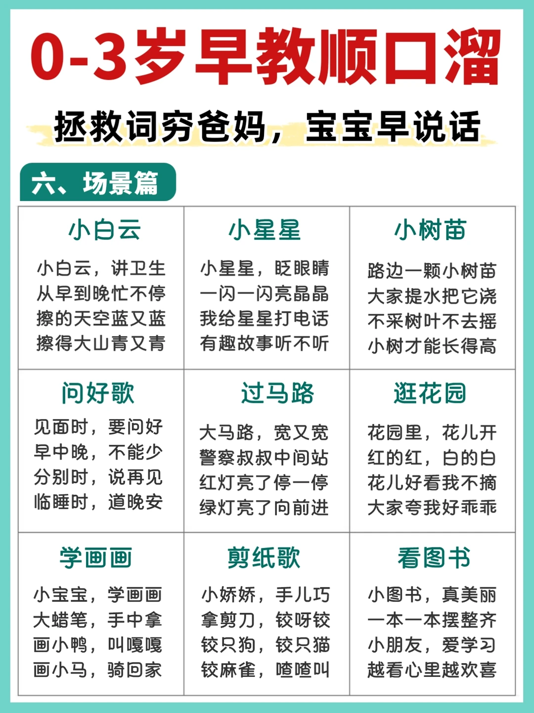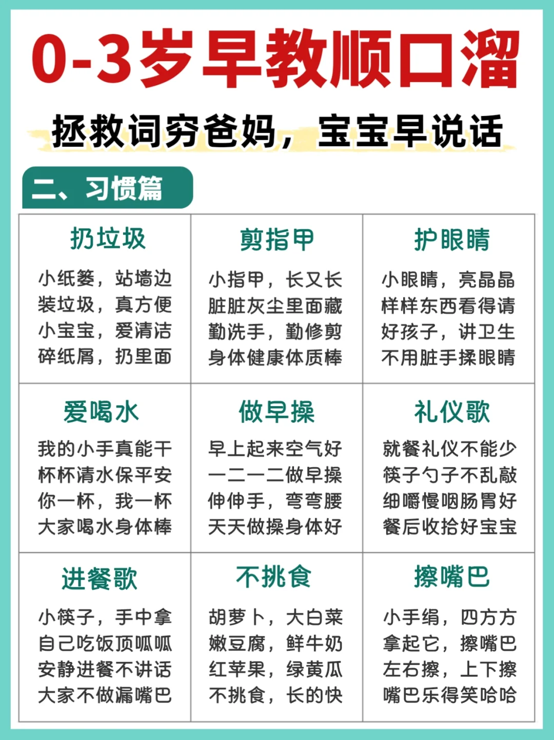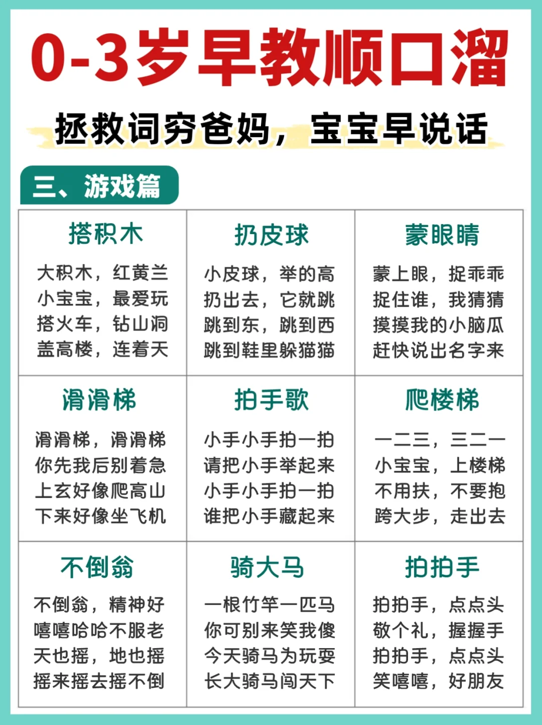 宝宝0-3岁的早教顺口溜给大家整理出来了! 给孩子上早教中心的时候, 明确说了这是宝宝语言启蒙好方法! 爷爷奶奶在家带娃的也可以打印出来! 每天念一念,听一听!宝宝早开口!