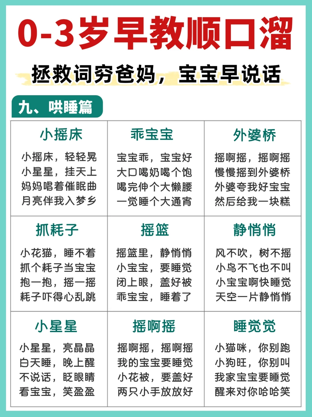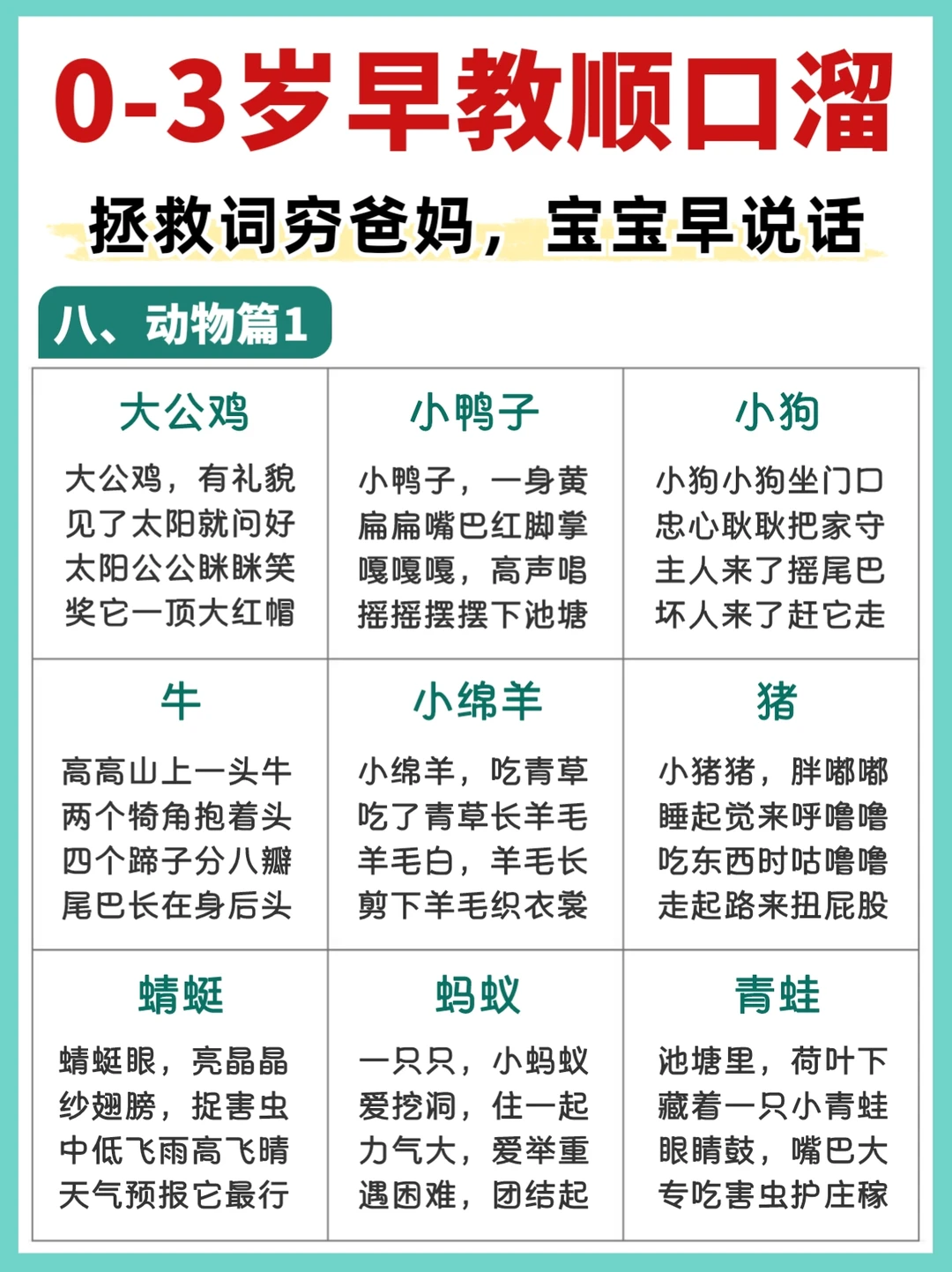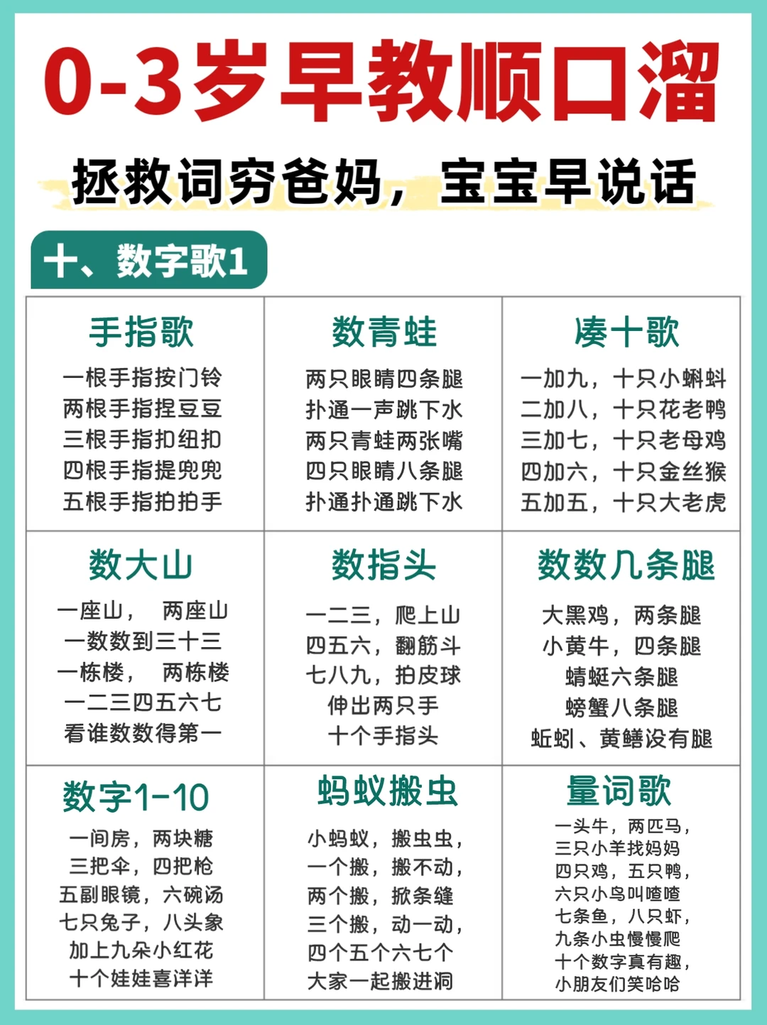 宝宝0-3岁的早教顺口溜给大家整理出来了! 给孩子上早教中心的时候, 明确说了这是宝宝语言启蒙好方法! 爷爷奶奶在家带娃的也可以打印出来! 每天念一念,听一听!宝宝早开口!