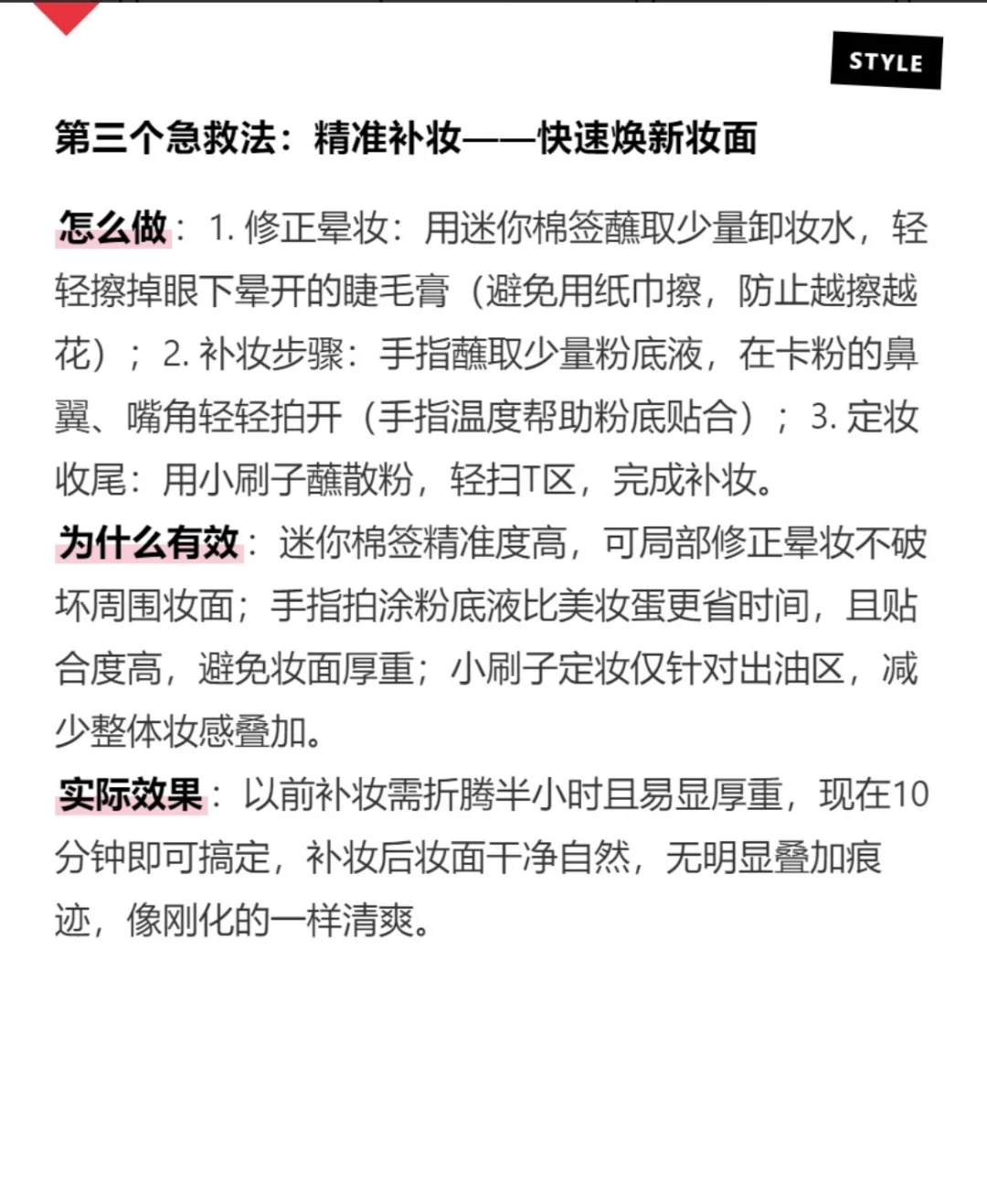 ✅第三个是精准补妆:用迷你棉签蘸卸妆水擦去晕染的睫毛膏,手指蘸少量粉底液拍开卡粉处,小刷子扫T区散粉,10分钟搞定,妆面干净不厚重。