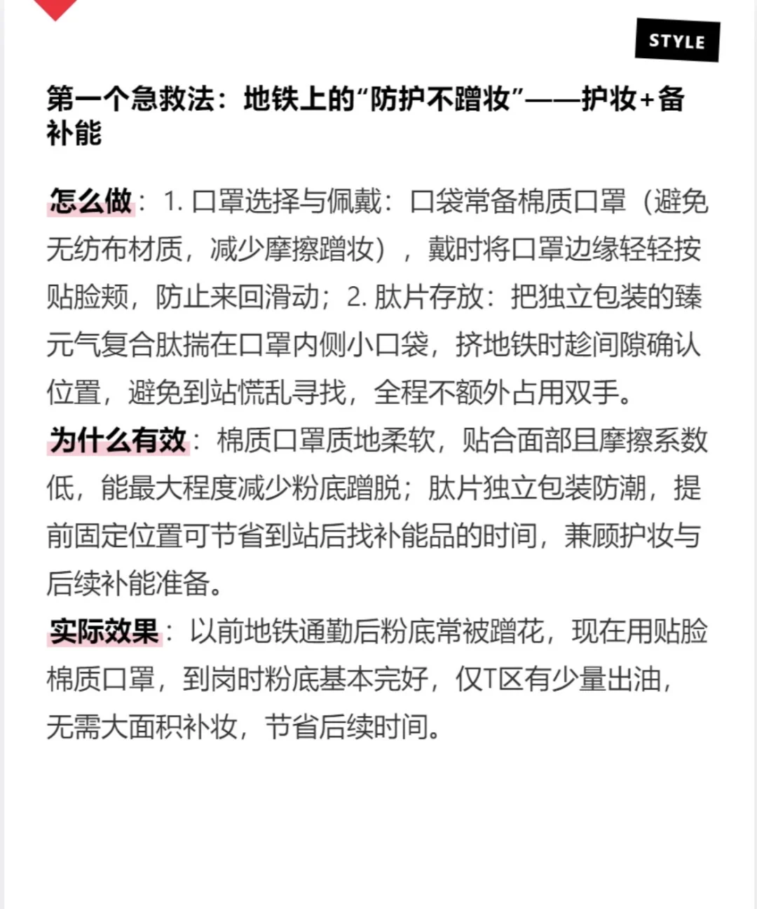 ✅第一个是地铁“防护不蹭妆”:口袋备棉质口罩,按贴脸颊防滑动蹭妆,还把独立包装的臻元气复合肽揣口罩内侧,避免到站慌找。现在到岗粉底基本不花,只剩T区微出油。