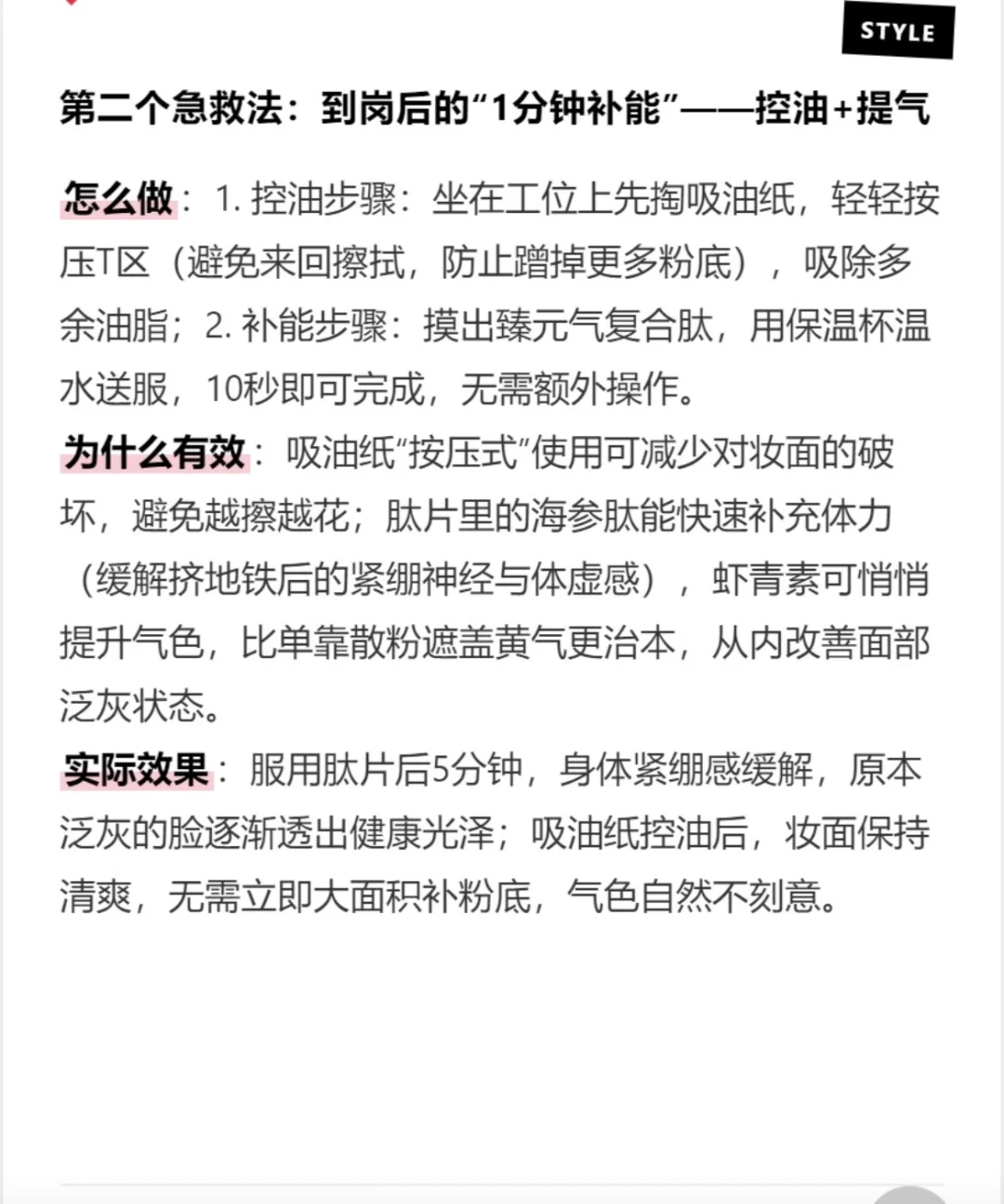 ✅第二个是到岗“1分钟补能”:先拿吸油纸按T区去油(不来回擦),再吞1片肽片。海参肽快速补体力、缓神经,虾青素悄悄提气色,泛灰的脸慢慢透光泽,比散粉盖黄气有用。