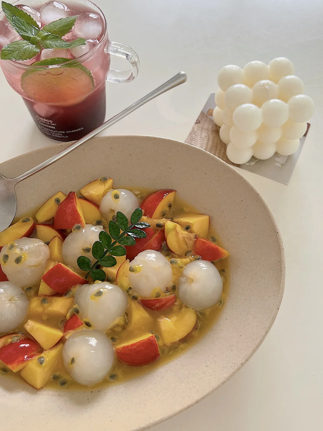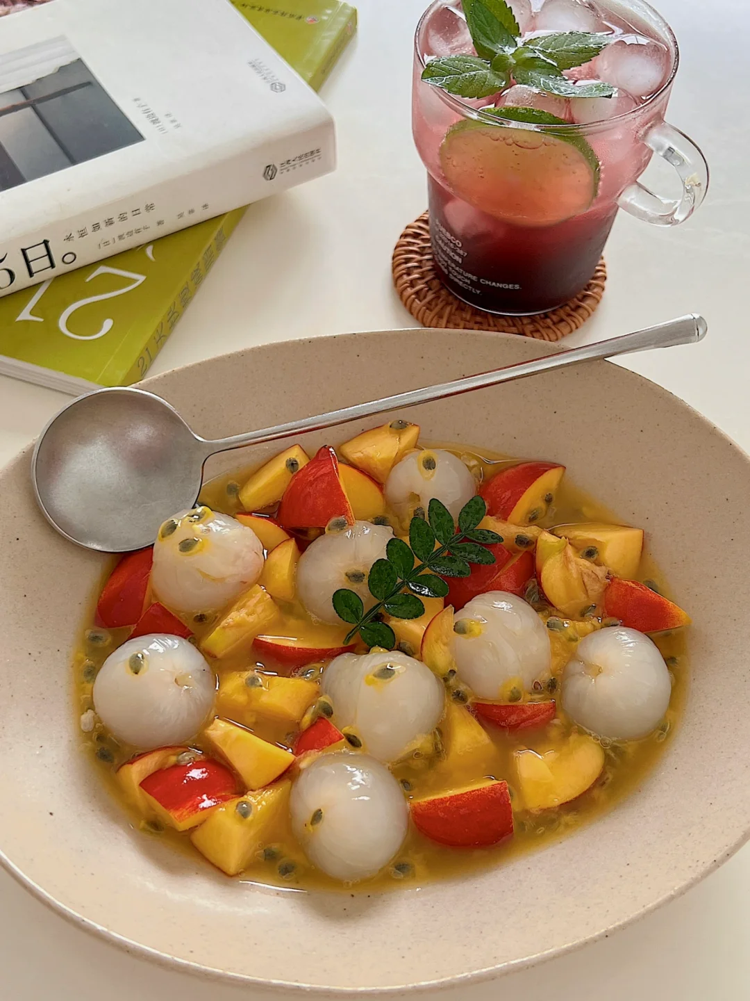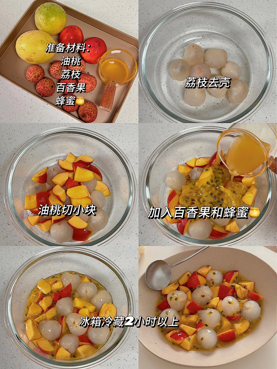 夏季的水果都逃不过我的手里了,今天尝试用油桃,也是好吃的耶✌️ 做法见图3️⃣ 🍃荔枝去壳,油桃切块 🍃加入百香果和蜂蜜 🍃冰箱冷藏2小时 真的吃不腻! 现在有水果我就要拉一下百香果来做陪衬,实在太方便太好吃了😋~快让你手残的闺蜜来试试吧~