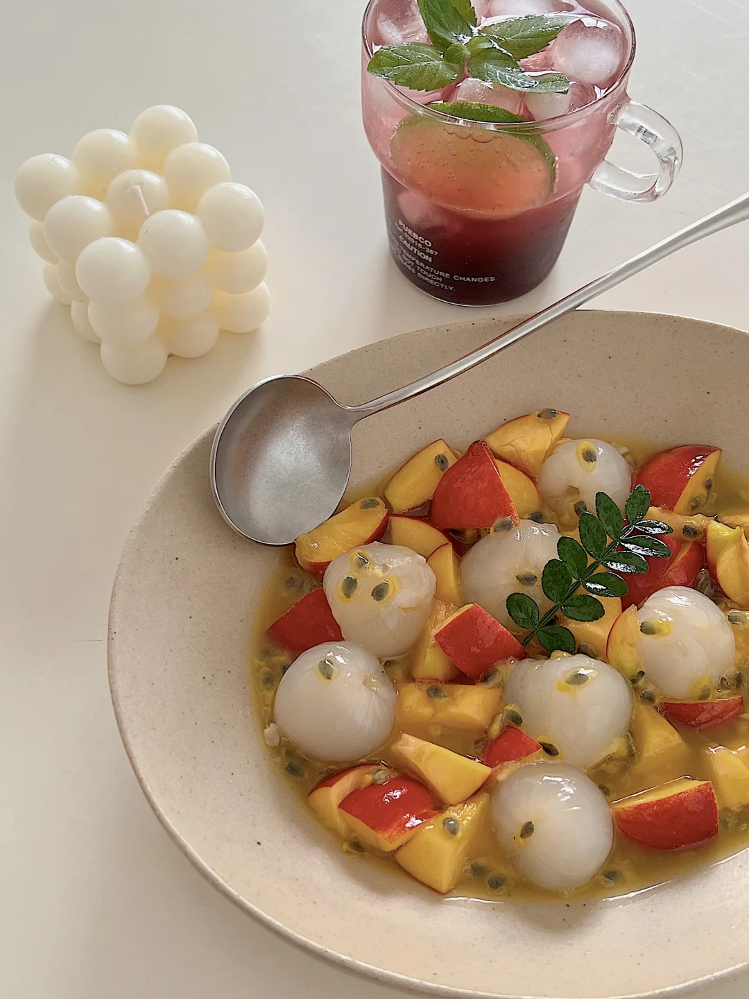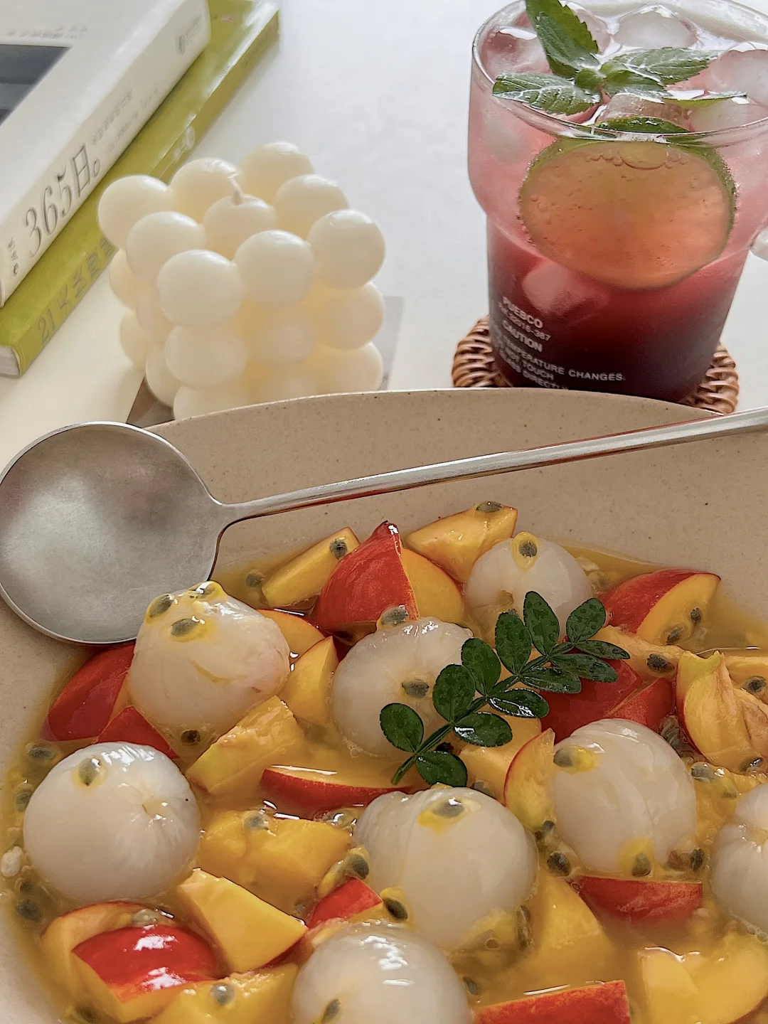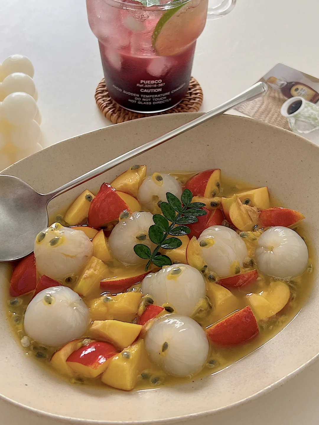 夏季的水果都逃不过我的手里了,今天尝试用油桃,也是好吃的耶✌️ 做法见图3️⃣ 🍃荔枝去壳,油桃切块 🍃加入百香果和蜂蜜 🍃冰箱冷藏2小时 真的吃不腻! 现在有水果我就要拉一下百香果来做陪衬,实在太方便太好吃了😋~快让你手残的闺蜜来试试吧~