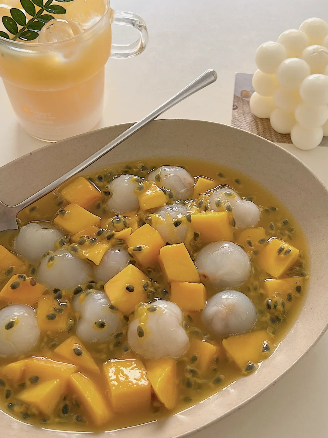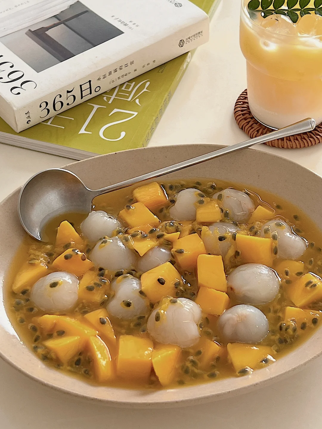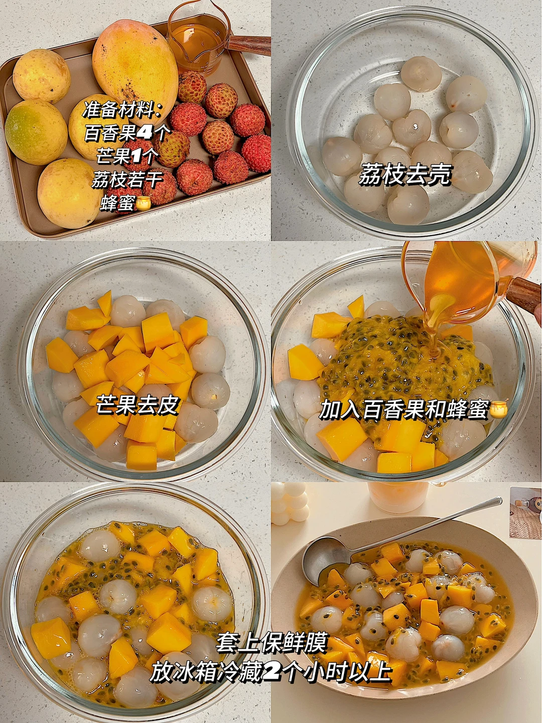 家里水果太多,立刻想到百香果渍水果,这一渍好吃到尖叫🙀酸酸甜甜的停不下来~ 材料:百香果|荔枝|芒果|蜂蜜 做法p3: ☘️荔枝去壳,芒果去皮切块 ☘️加入百香果和蜂蜜 ☘️盖上保鲜膜放冰箱冷藏2个小时以上 (千万不要着急吃,冷藏这一步是好吃加成的关键哟) 夏天有这招再也不怕水果浪费啦!水果技能get+1,快