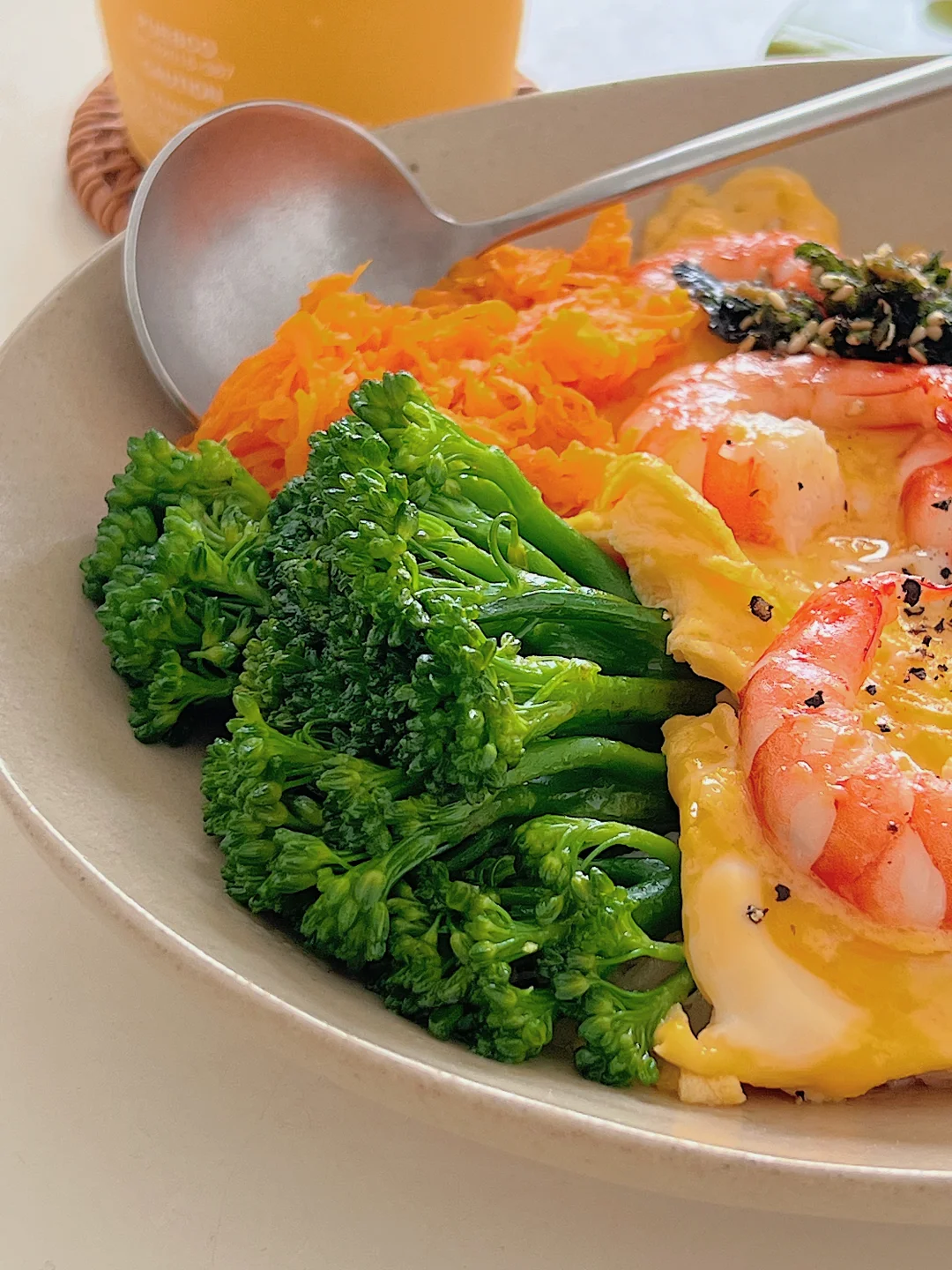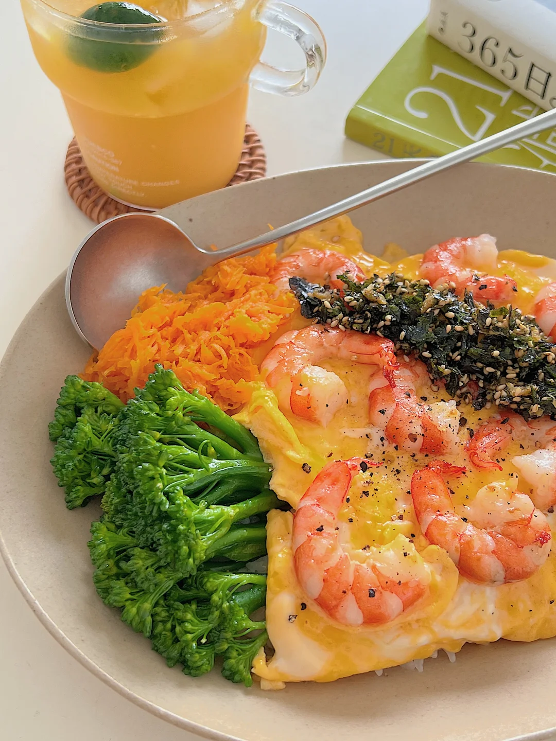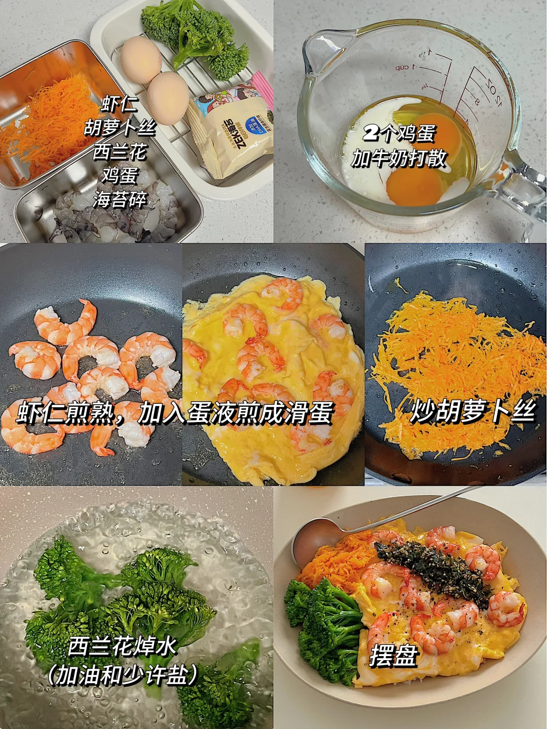 「食材清单」「低卡到飙泪的配置」 鲜虾仁|胡萝卜|西兰花|鸡蛋2个|海苔碎 做法: ✨鸡蛋加牛奶打均匀,备用 ✨虾仁煎熟,加入蛋液全程小火晃出布丁质感 ✨西兰花焯水时加少许油和少许盐!胡萝卜丝炒到透亮 ✨摆盘:米饭打底→淋滑蛋→堆蔬菜→撒海苔碎! 吃完盘子光光的满足感谁懂啊!!! 健身党/上班族/身材管理期的姐妹快码住[赞R][派对R]