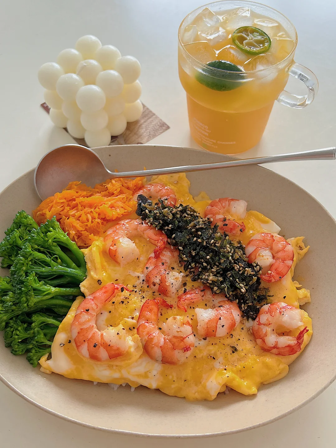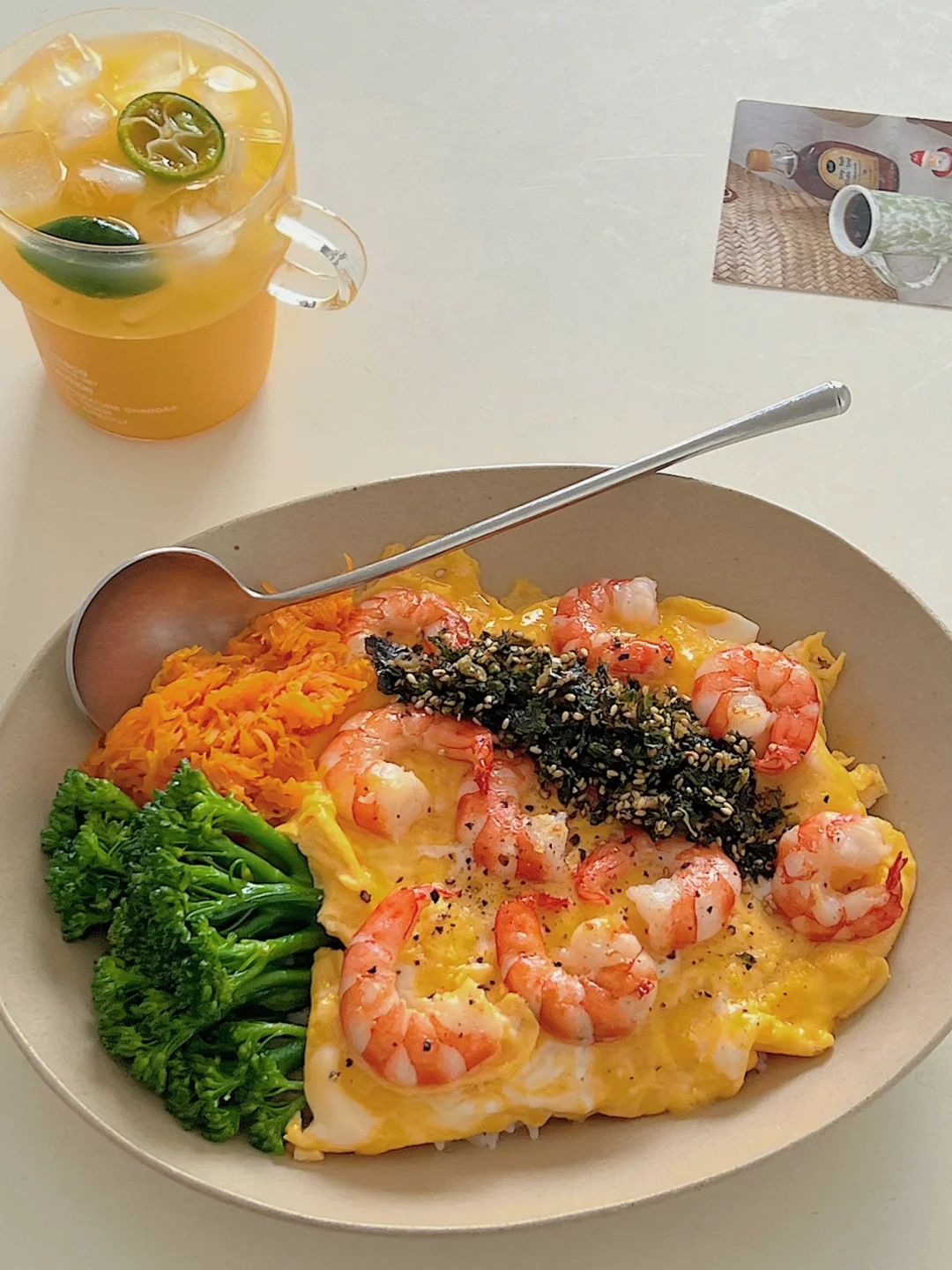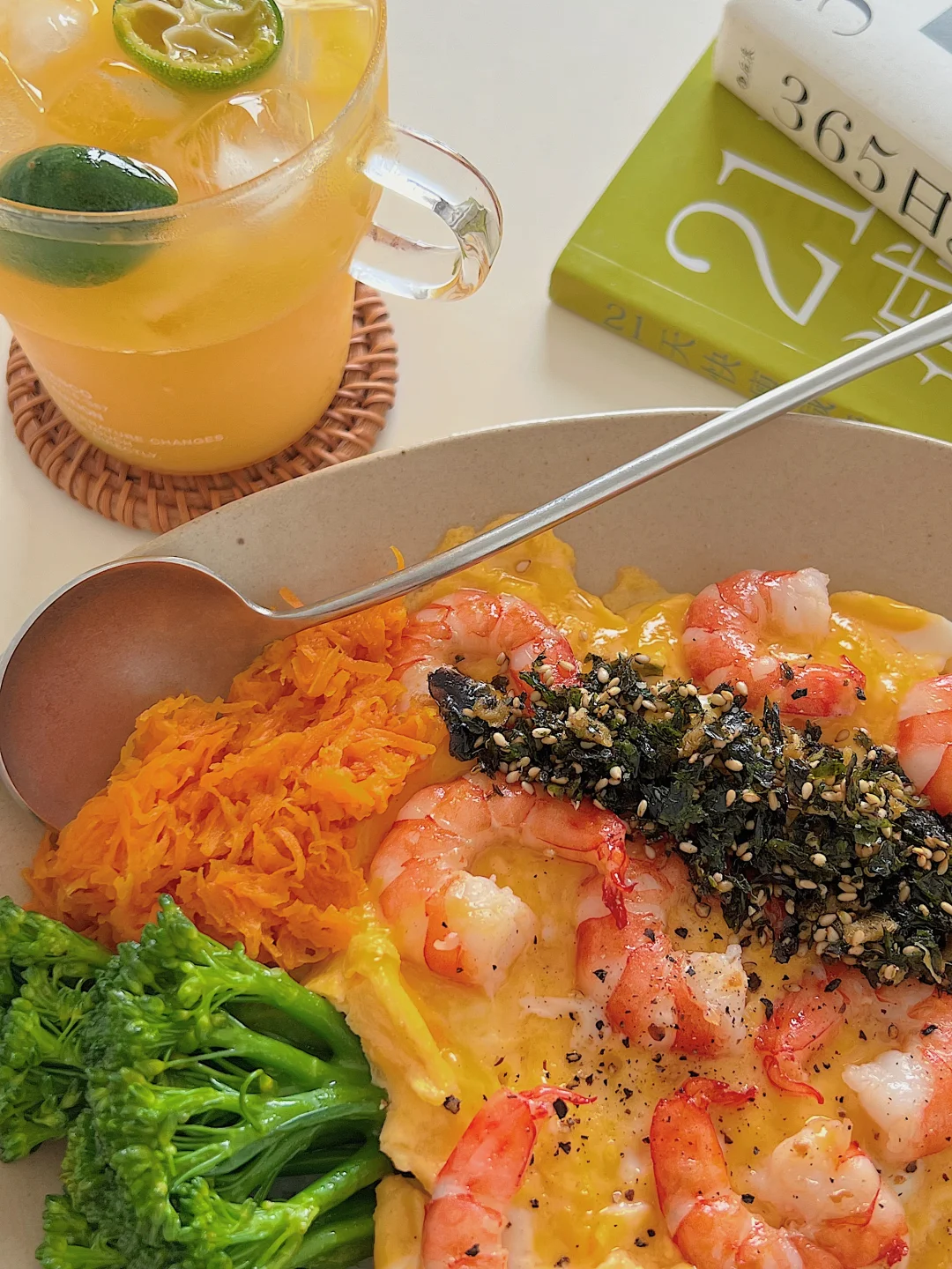 「食材清单」「低卡到飙泪的配置」 鲜虾仁|胡萝卜|西兰花|鸡蛋2个|海苔碎 做法: ✨鸡蛋加牛奶打均匀,备用 ✨虾仁煎熟,加入蛋液全程小火晃出布丁质感 ✨西兰花焯水时加少许油和少许盐!胡萝卜丝炒到透亮 ✨摆盘:米饭打底→淋滑蛋→堆蔬菜→撒海苔碎! 吃完盘子光光的满足感谁懂啊!!! 健身党/上班族/身材管理期的姐妹快码住[赞R][派对R]