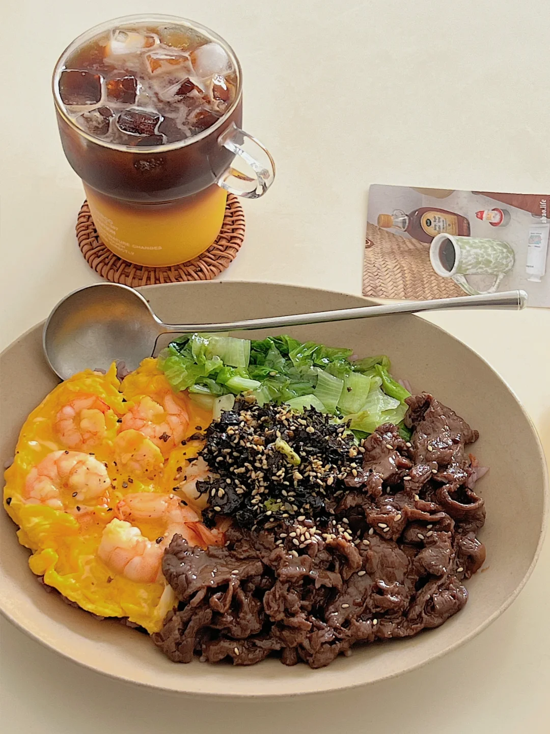 金黄滑蛋裹着Q弹虾仁🍤嫩到爆汁的牛肉撒满芝麻香 再配一杯橙C美式☕️这搭配我真的会爱一辈子!! 做法p3: [樱花R]牛肉用生抽、蚝油、玉米、玉米淀粉抓匀,封上一层油腌制15分钟,炒熟 [樱花R]虾仁去壳和虾线,煎熟后加入蛋液煎成滑蛋 [樱花R]生菜加少许盐炒熟 [樱花R]摆盘,再来一杯橙c美式 ✨今日份干净饮食打卡成功 评论区交出你们的作业!😆
