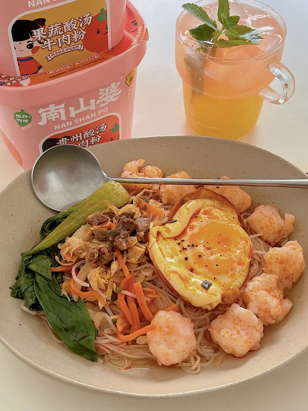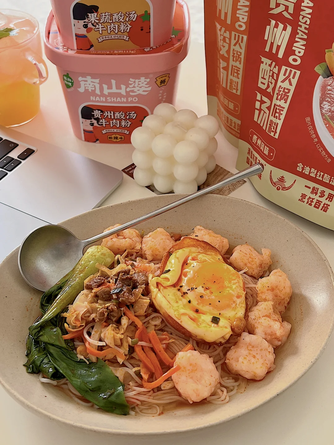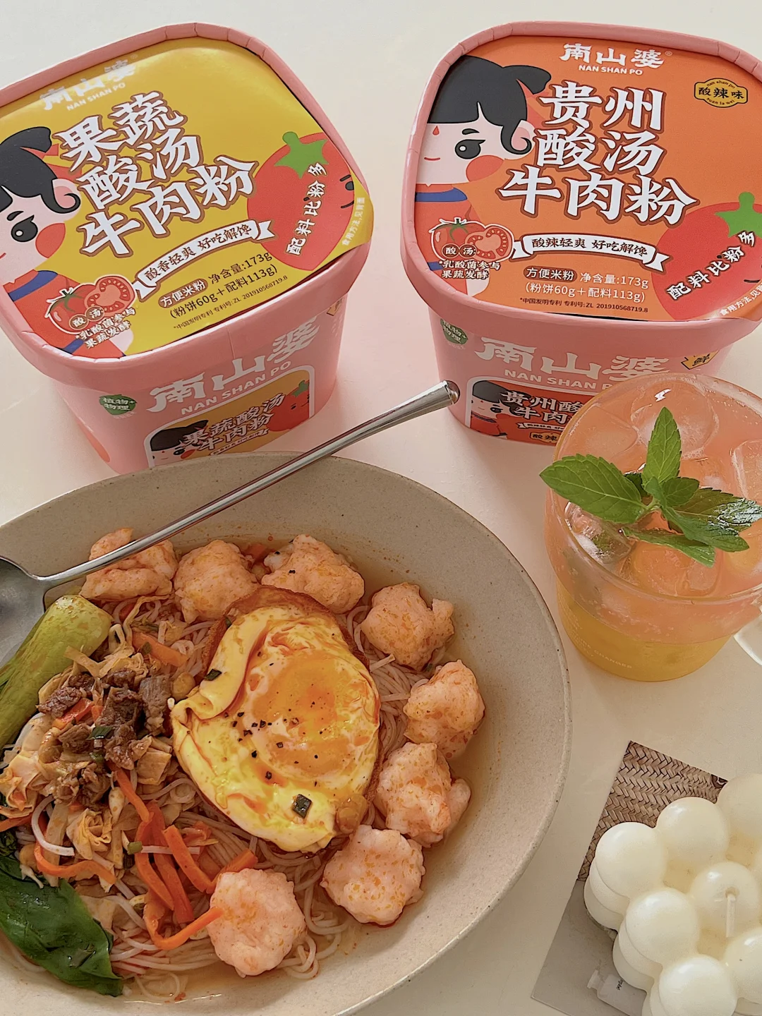 [彩虹R]最近工作太忙了,总是顾不上一日三餐。有时候在外面解决有时候外卖,但总觉得差点意思,还好我发现了南山婆的这款酸汤牛肉粉,方便快手,很适合独居或者初打工人[赞R],而且有两种口味可以选择,6分钟开水冲泡就能吃上美味😋不需要任何技术含量,适合小白。酸汤是乳酸菌参与果蔬发酵的,多汁爽口,里面还有大块牛肉,真的很过瘾,我又入了火锅底料在家做水煮菜,这个阶段的管理期水煮菜又有着落了。再忙也要好好爱自己~[吧唧R]