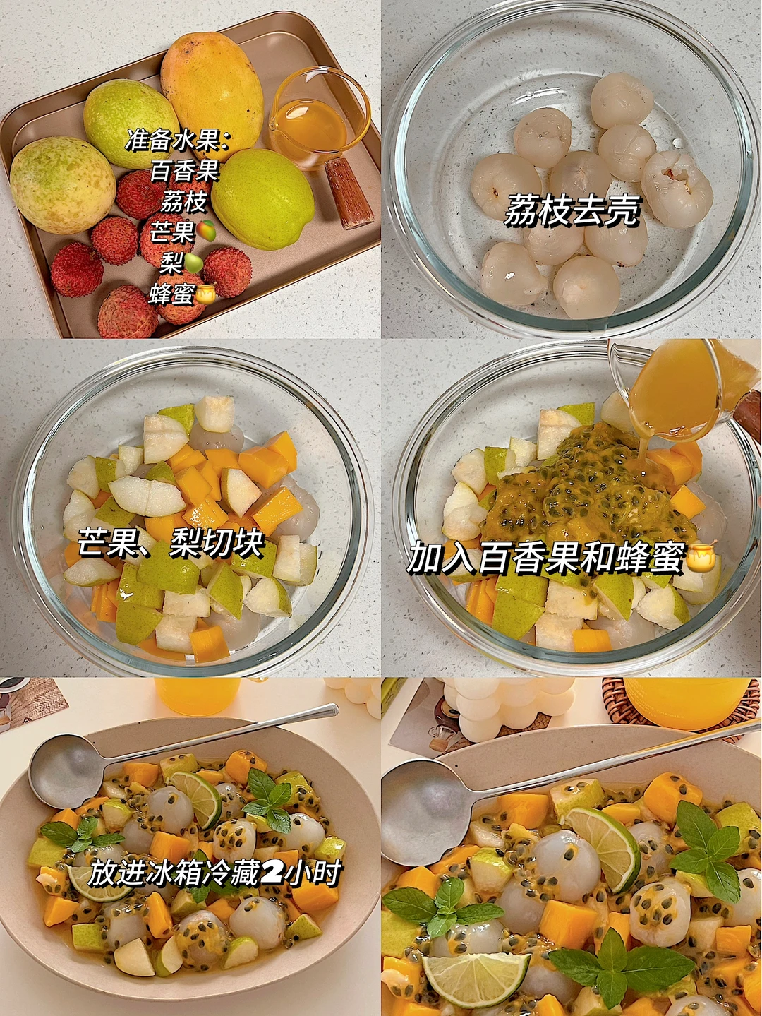 又来渍水果啦 这次加了梨🍐 还不错哦 做法: 荔枝去壳、芒果、梨切块 加入百香果和蜂蜜🍯 放进冰箱冷藏2个小时即可 🔥天气热来一份渍水果太滋养心灵了 宝宝们快来消暑[彩虹R]