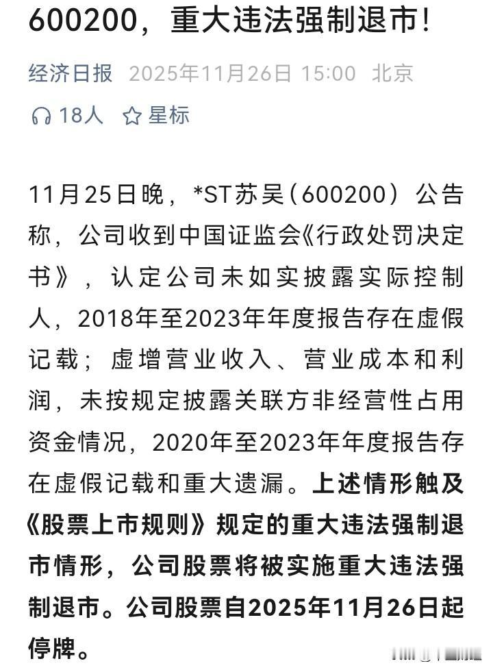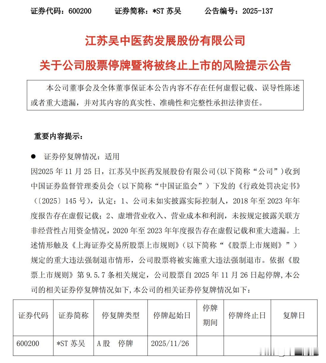 【强制退市!】股价从42元跌到目前的1.24元,昨天停牌,但是最新公告显示:公司将被强制退市。 公告显示:江苏吴中因2018年至2023年年度报告存在虚假记载;虚增营业收入、营业成本和利润,未按规定披露关联方非经营性占用资金情况,2020年至2023年年度报告存在虚假记载和重大遗漏。上述情形触及《股票上市规则》规定的重大违法强制退市情形,公司股票将被实施重大违法强制退市。公司股票自2025年11月26日起停牌。 从42元跌到1元,期间有多少投资者被套在其中出现重大亏损呢?财务造假,关联交易资金等情况,实际上,在财务报表以及行业分析中,已经无法掩盖,因此,投资股票市场一定要防范那些脱离行业基本面存在较大关联交易,虚构财务数据的公司!从目前季报以及半年报的情况来看,这样的公司还是存在的,一定要小心!