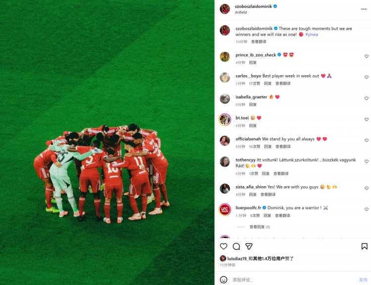 本场比赛索博斯洛伊可谓球队为数不多的亮点,曾一度扳平比分。索博斯洛伊也在社媒晒出球队首发合照,配文鼓励球队:“现在是艰难的时刻,但我们是冠军之师,我们将会团结一致站起来!”