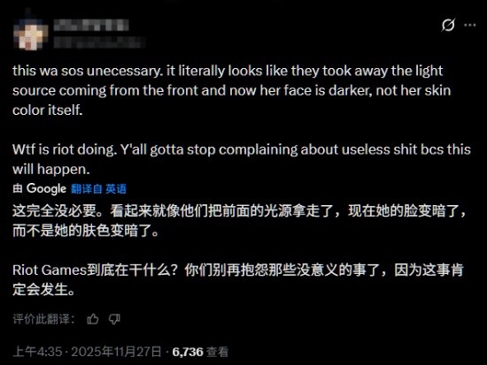 不过也有不少玩家不喜欢这样的改动,认为完全没必要!有玩家吐槽:“看起来更像是将前面的光源拿走了”,而不是肤色的变化。”“旧版有什么问题?难道不是光源问题吗?”