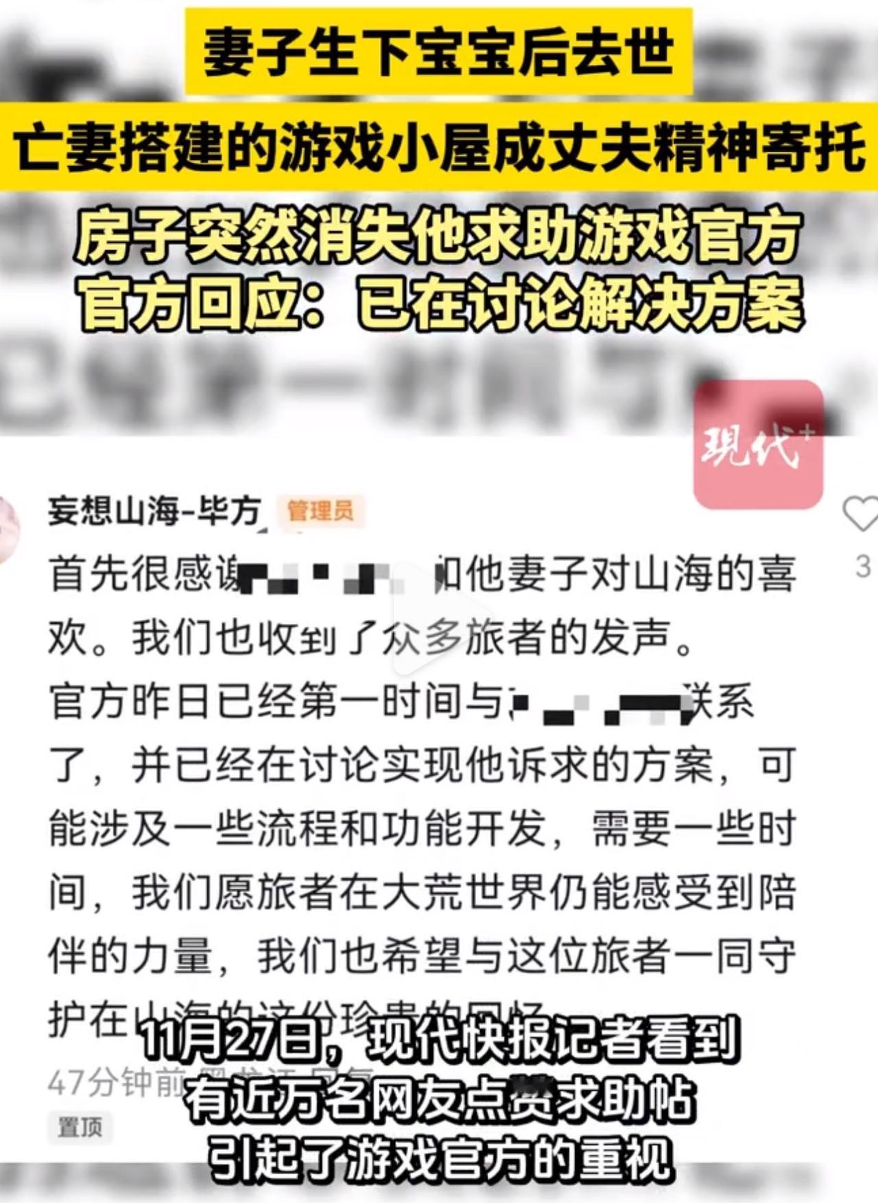 真的谁懂啊家人们!为了给老婆治病,把现实房子都卖了,到最后人还是没留住,就剩游戏里一间小屋当念想,结果连这最后一点寄托都凭空没了,看着就心里堵得慌、揪得疼! 这大哥跟他老婆2019年就凑到一块儿了,俩人没事就在《妄想山海》里搭小屋,一砖一瓦都是俩人的小回忆。谁成想2024年初,他老婆怀着孕偏偏查出急性白血病,化疗、早产,俩人拼了老命救治,还是没能留住她,今年4月就走了。医药费把家底彻底掏空,连房子都卖了,就剩游戏里这小屋,是他想老婆的唯一指望,每周都准时上线打理,跟守着老婆留下的念想似的。 可11月下旬再上线一看,小屋居然没了,就剩一片光秃秃的农田。换作是谁不得懵圈、慌神啊?心里的苦没处倒,连哭都没地方发泄。老婆走了,账号要人脸识别登不上,找客服也没人搭理,实在走投无路了,才在游戏社区发帖求助,还说为了救老婆,他办了12张献血证,这话一听,谁不鼻子发酸啊? 帖子一发,好几万网友都替他发声,都说这才是实打实的爱,一个劲呼吁官方留住小屋。现在官方虽说联系他了,但就扯着要走流程、开发新功能,没给半点儿准信儿。说实话,这哪是啥虚拟房子啊,是他对亡妻的念想,是他活下去的一点光啊! 游戏本身就有漏洞,数字遗产也没人管,可在这份真心实意的思念面前,这些都太刺眼了。就盼着官方能多讲点人情世故,把小屋给复原了,别让他最后一点念想,被一行破代码给碾碎了。亡妻在游戏中的房子没了男子求助 数字遗产 妄想山海