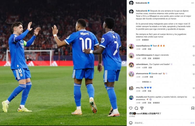 巴尔韦德也在社媒晒出与姆巴佩、维尼修斯庆祝合影,配文写道:“经过一周的风波,我们比以往任何时候都更加团结。拥有维尼修斯和姆巴佩是我们的幸运,但能够拥有一支全力以赴的世界最佳球队更是我们的荣幸。就我个人而言,我正在努力恢复到最佳状态。主教练一直在我身边支持我,尽一切可能帮助我继续成长并为球队做出贡献。虽然并不总是一帆风顺,但我们教练组和球员们比以往任何时候都更加团结。”