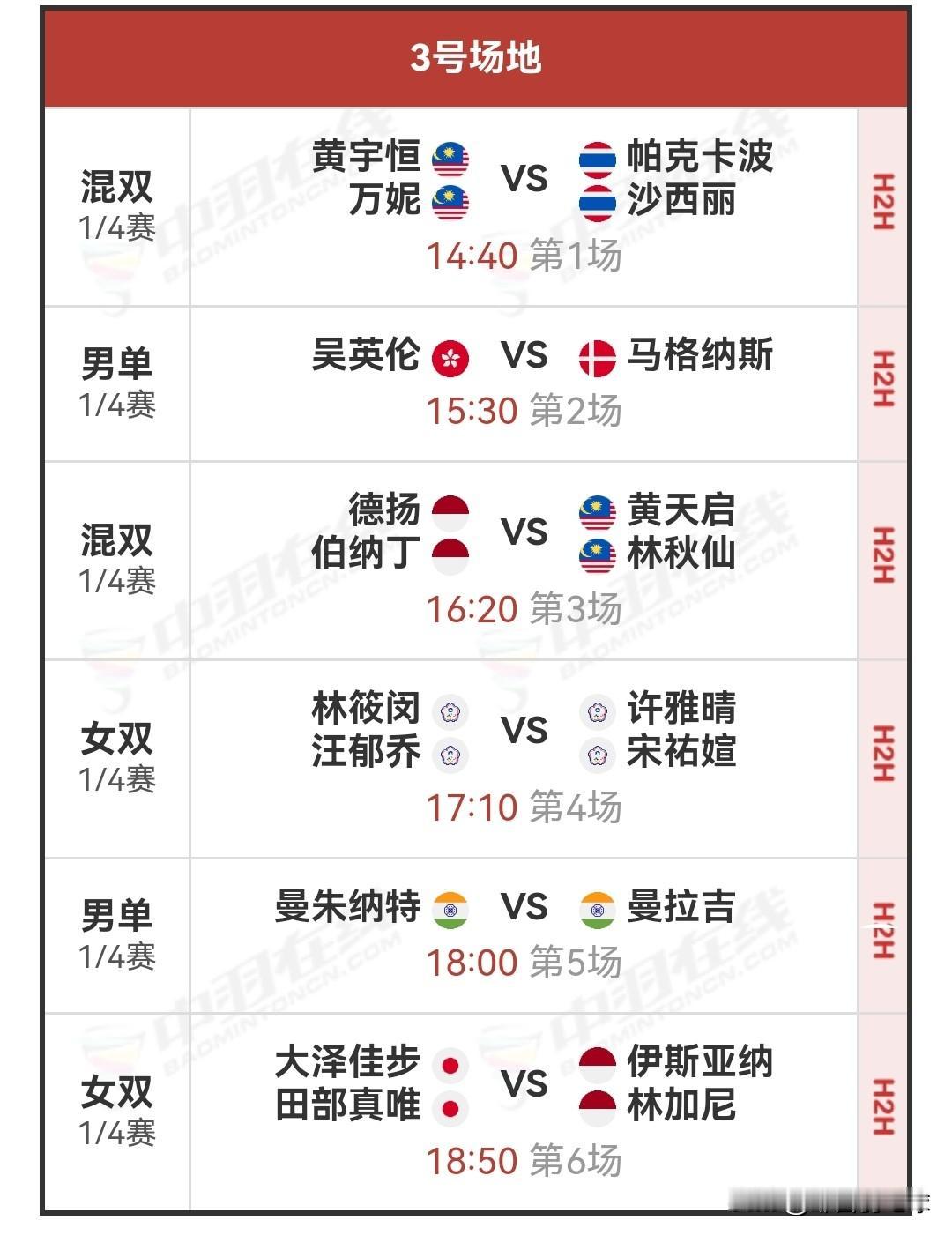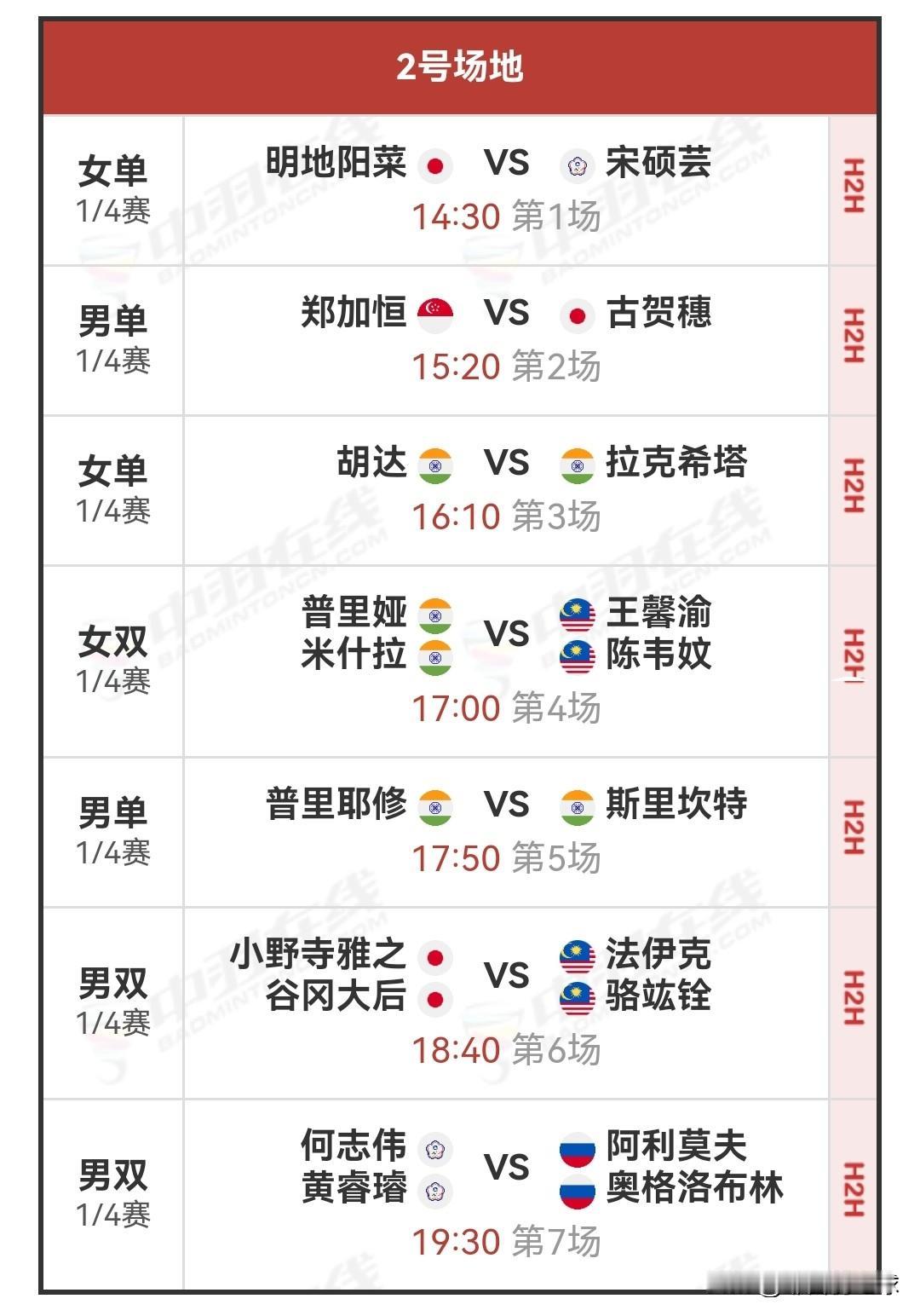 11月28日赛德莫迪羽毛球国际赛1/4决赛安排 今日赛事圆满收官。老将奥原希望在今日比赛中历经三局苦战,最终被东道主夏尔马逆转淘汰。这位曾经的世界排名第一如今风采不再,着实令人感叹“落魄的凤凰不如鸡”。 明日北京时间14:30,1/4决赛将拉开帷幕,届时共有三块场地同时进行比赛,详细对阵安排如下: 羽毛球赛事 羽毛球 羽毛球爱好者 羽毛球比赛 羽毛球赛程