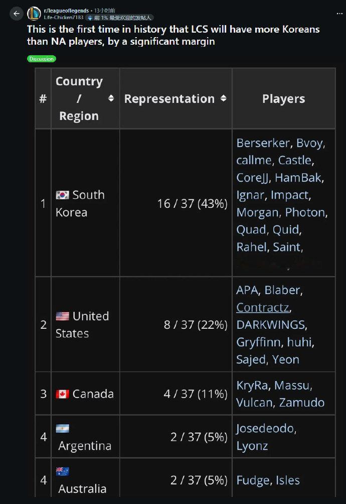 LCS北美赛区确认将于明年回归,但一份选手名单统计却在海外社区引发热议:明年赛区内的北美本土选手仅剩12人,而韩国选手比例首次完成反超。有网友直接调侃道:"NA = No Americans"。往年数据:2026年:韩援占比43%,北美选手33%2025年:韩援33%,北美35%2024年:韩援31%,北美50%2023年:韩援29%,北美46%2022年:韩援18%,北美42%英雄联盟S15 2025LOL冬季转会期