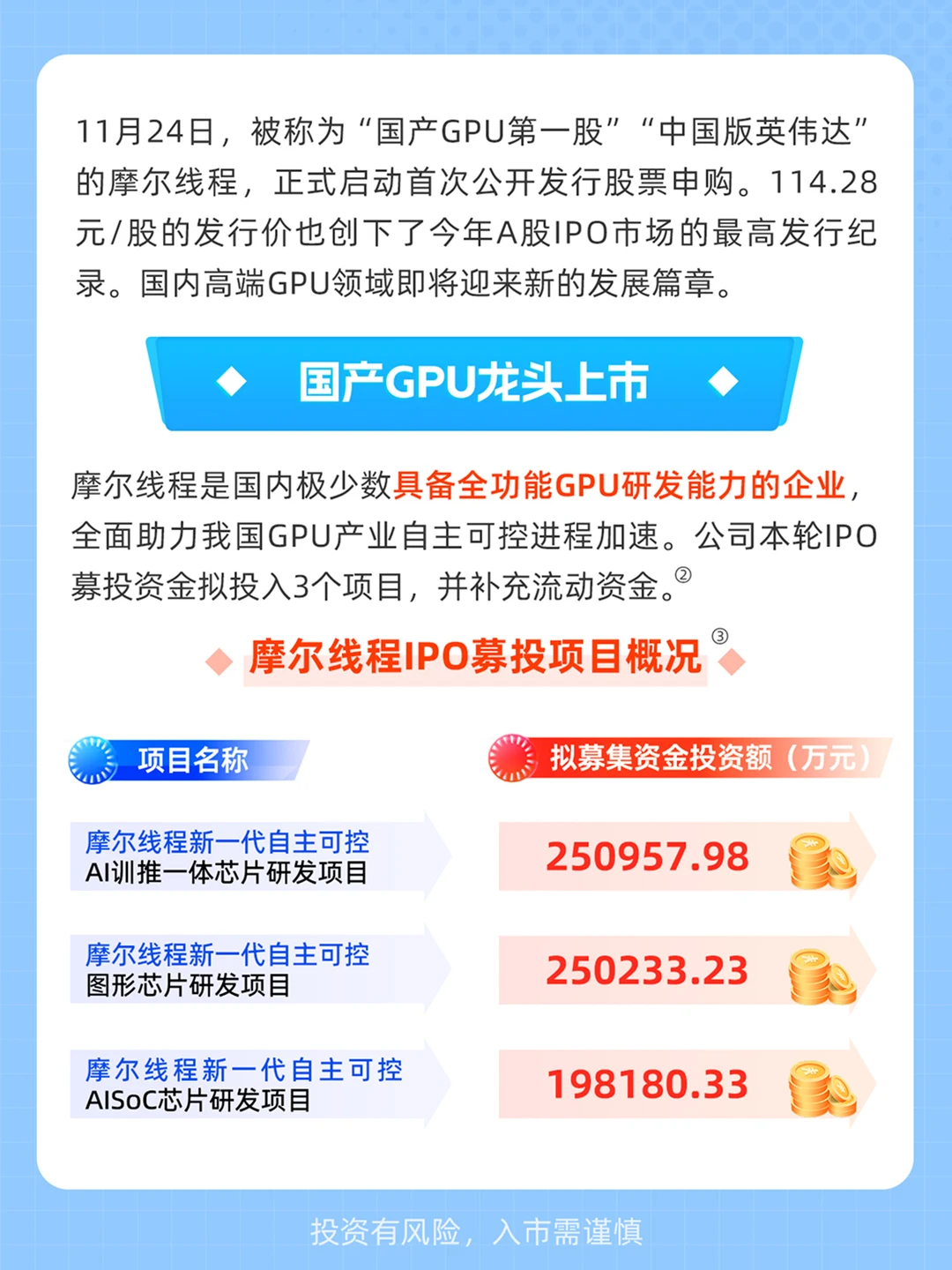 📅11月24日,被称为“国产GPU第一股”“中国版英伟达”的摩尔线程, 📈正式启动首次公开发行股票申购。 💰114.28元/股的发行价也创下了今年A股IPO市场的最高发行纪录。 🚀国内高端GPU领域即将迎来新的发展篇章。
