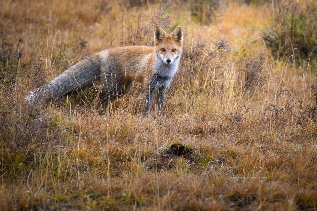 藏狐(最常见的食肉兽)在积雪上留下一串脚印,赤狐如火掠过草甸;