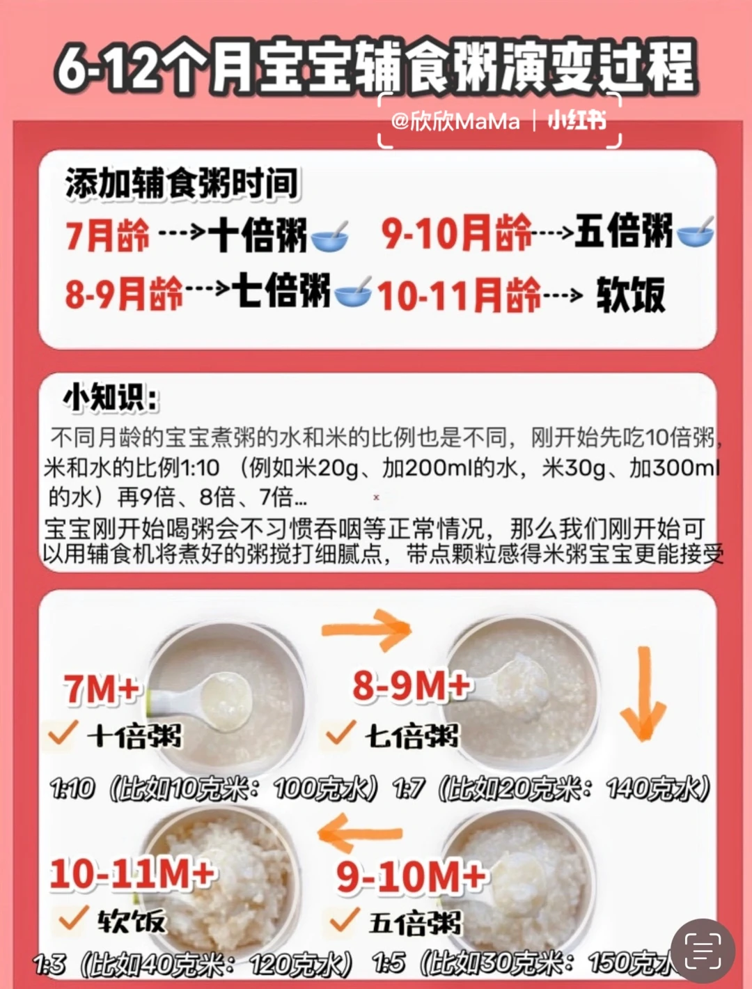 1️⃣刚开始先吃10倍粥,米和水的比例1:10 (例如米20g、加200ml的水,米30g、加300ml的水)再9倍、8倍、7倍…