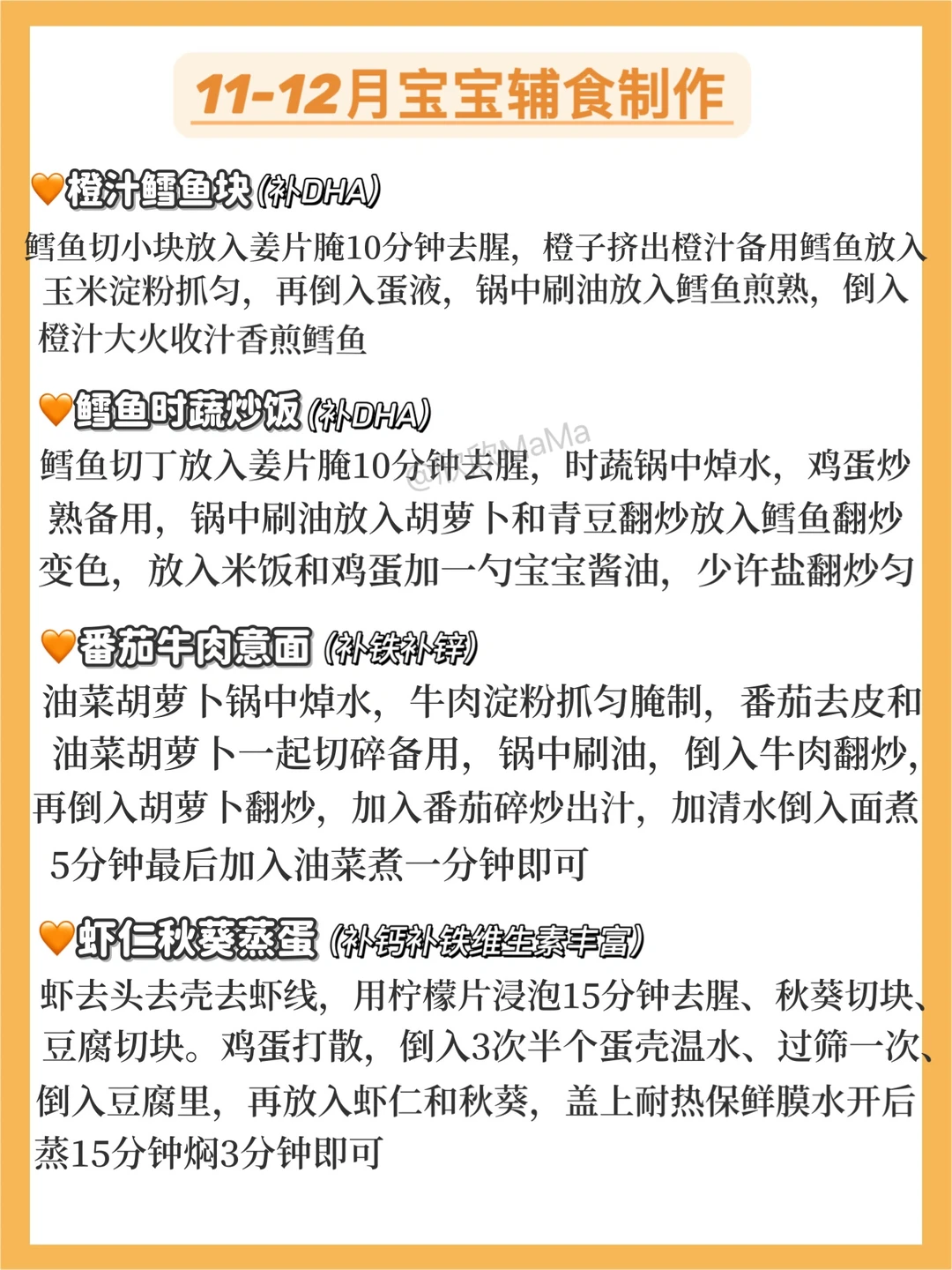 ▫️12月龄+:香煎三文鱼、虾仁蒸蛋、海带牛肉面等