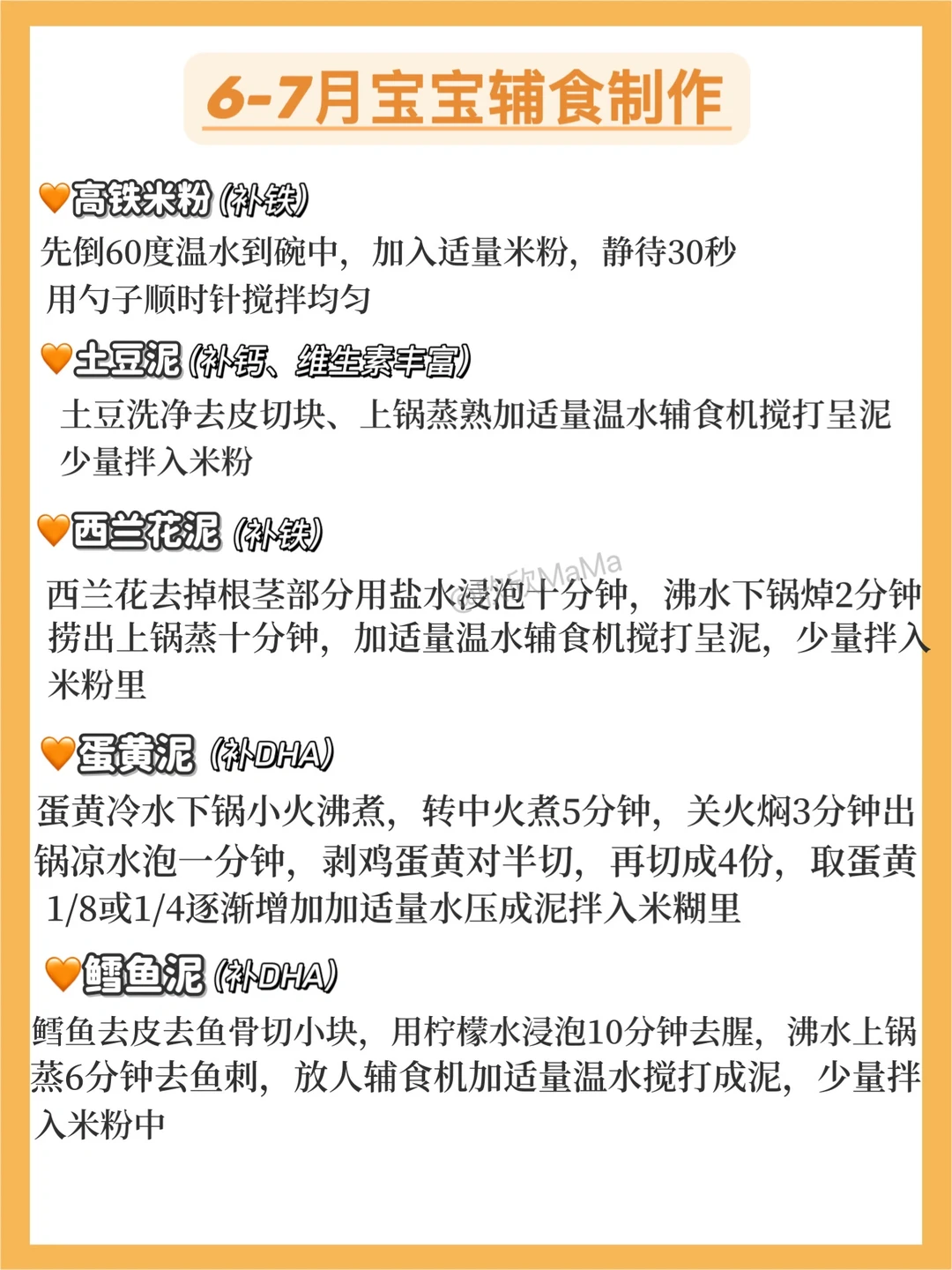 ▫️6-7月龄:土豆泥、猪肉泥、西兰花土豆泥、胡萝卜白菜泥等