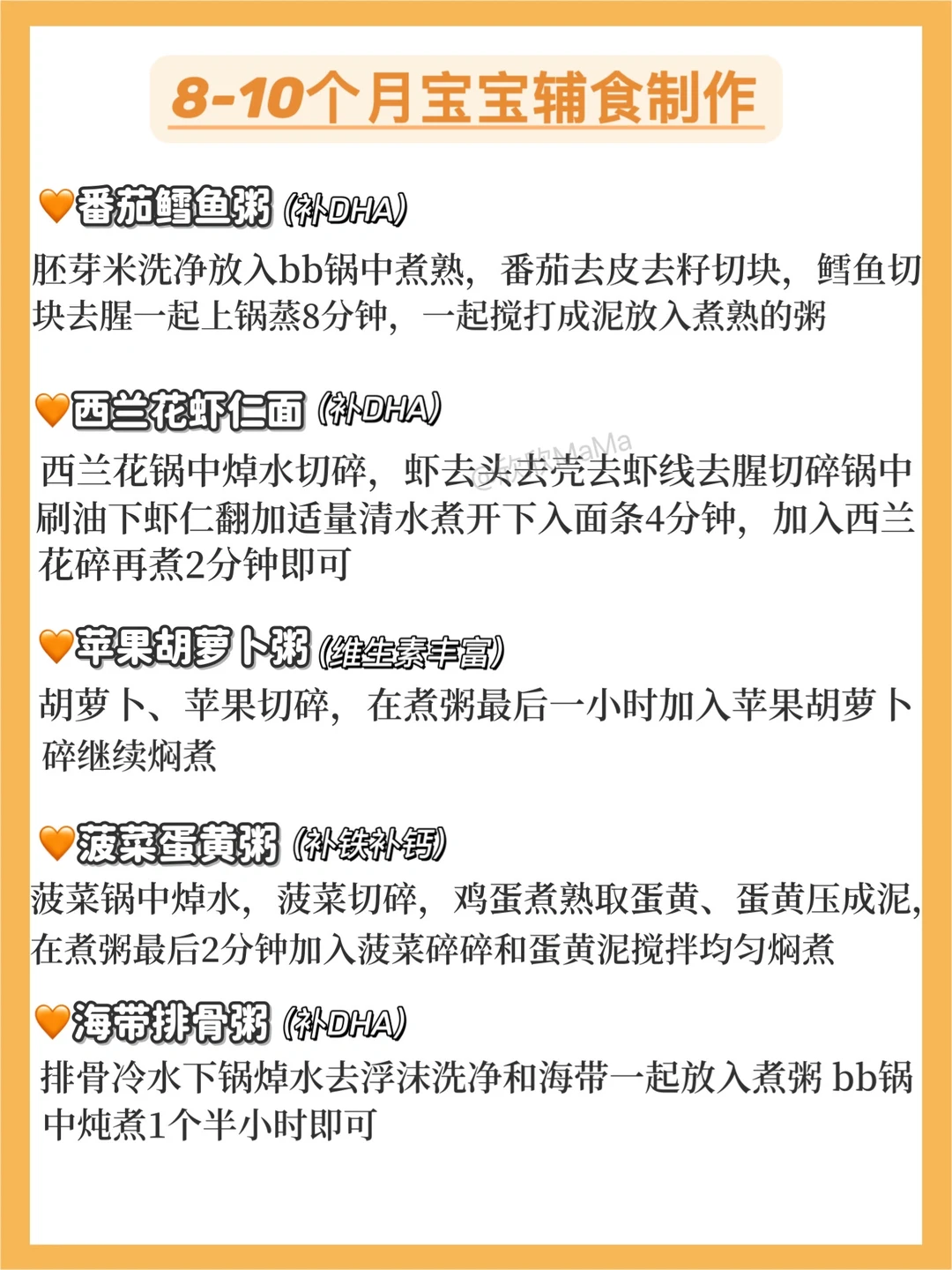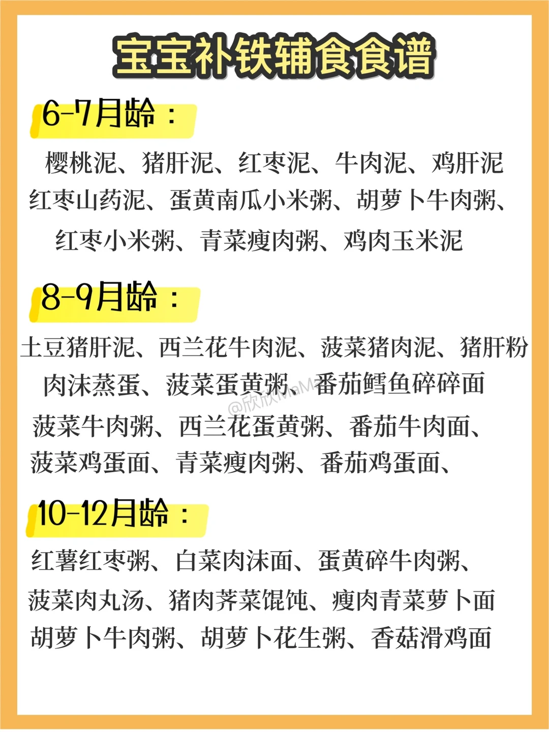 ▫️8-9月龄:土豆猪肝泥、西兰花牛肉泥、猪肝粉、菠菜蛋黄粥、菠菜鸡蛋面、番茄鳕鱼碎碎面