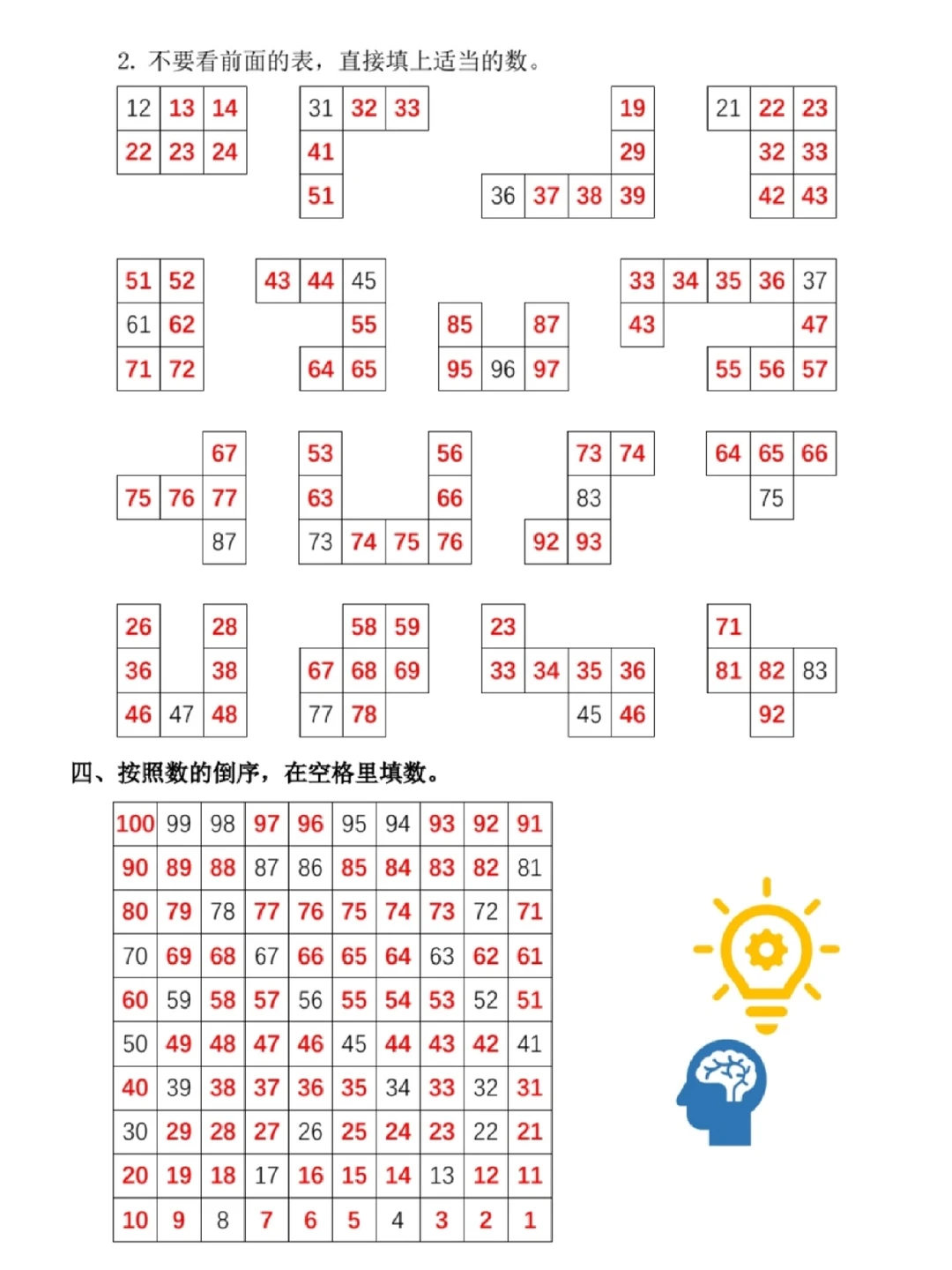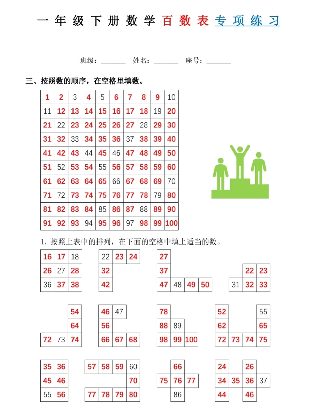 一年级下册数学百数表