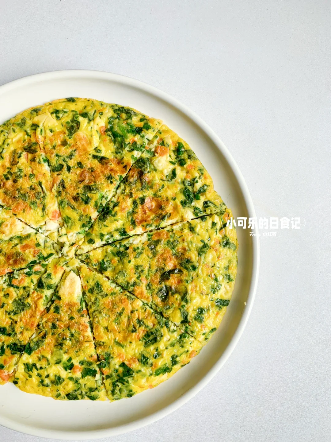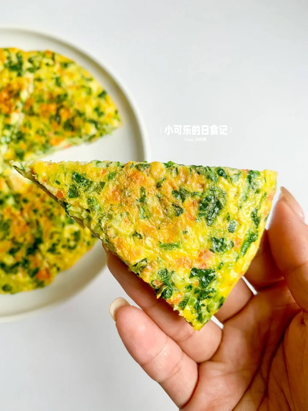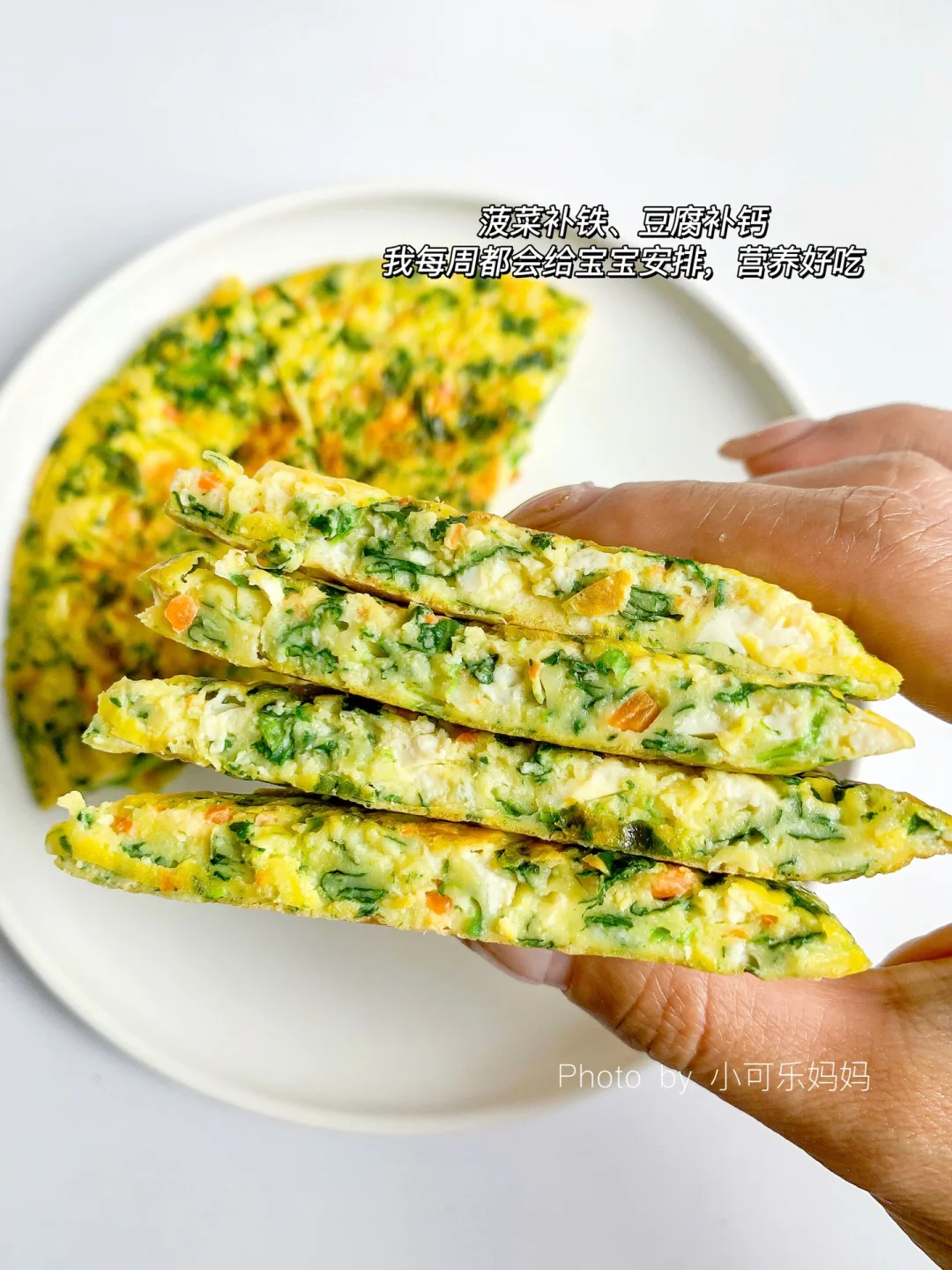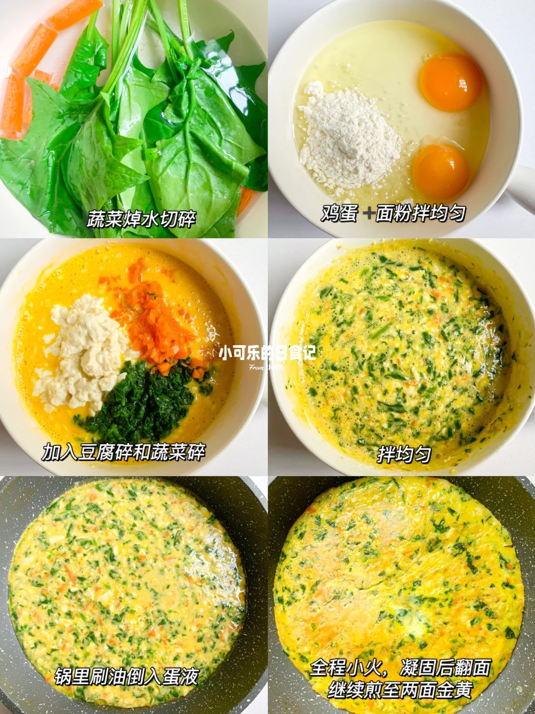 今天分享了这款全家人都爱吃的菠菜鸡蛋饼,如果家里有不爱吃的蔬菜的宝宝试试这个。加了豆腐的蛋饼一口咬下去软软糯糯,可乐一块接一块的吃停不下来,还可以当作手指食物锻炼宝宝抓握能利和咀嚼能力。 - 🌟食材: 鸡蛋2个 面粉15克 豆腐 菠菜 胡萝卜 做法: 1⃣️豆腐焯水后压碎,菠菜胡萝卜焯水,切碎 2⃣️碗中打入两个鸡蛋,加入适量面粉搅拌至无颗粒状,加入焯水好的豆腐、蔬菜搅拌均匀 3⃣️锅中刷油,倒入面糊煎至一面定型后翻面,再煎至两面熟透 🌈1岁以上的宝宝可以适量添加宝宝盐、酱油调味