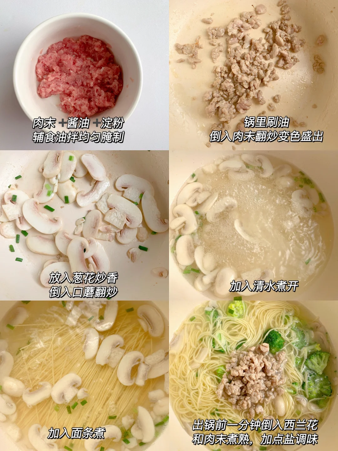 每次做这个肉末口蘑汤面,女儿都会吃光光的那种。做法简单,10分钟就可以搞定,各种肉 蛋,青菜都可以搭配,汤汁鲜美,一口下去营养满满[赞R] - 🌟食材 肉末 口蘑 西兰花 面条 葱 - 🌟做法: 1⃣️把所有食材处理成宝宝能接受的大小 2⃣️肉末加淀粉,酱油、辅食油腌制一会,下锅翻炒变色盛出,放入葱爆香加口磨炒软,倒入适量清水煮开 3⃣️放入煮软,出锅前加西兰花,肉末,少许盐煮熟即可