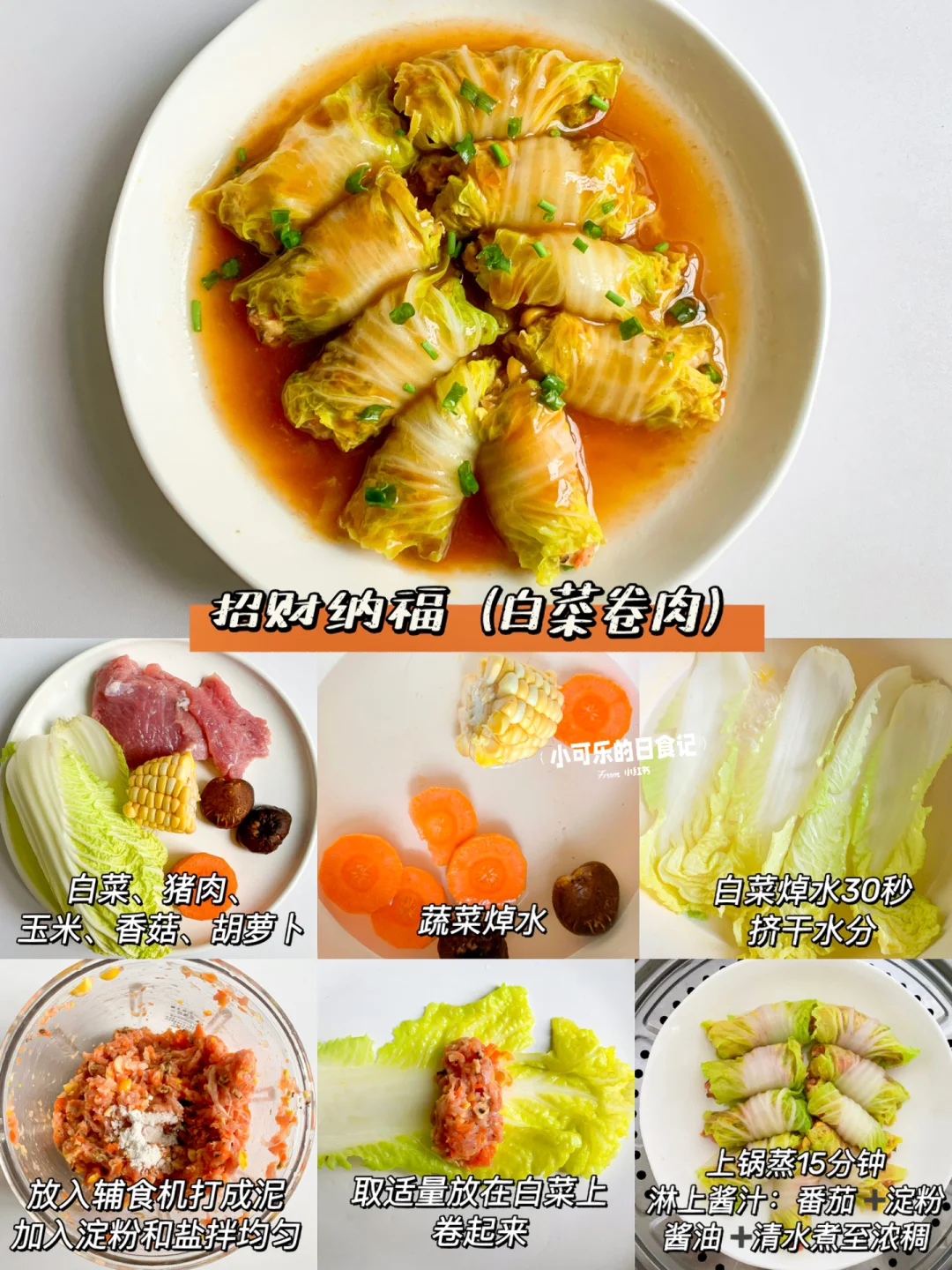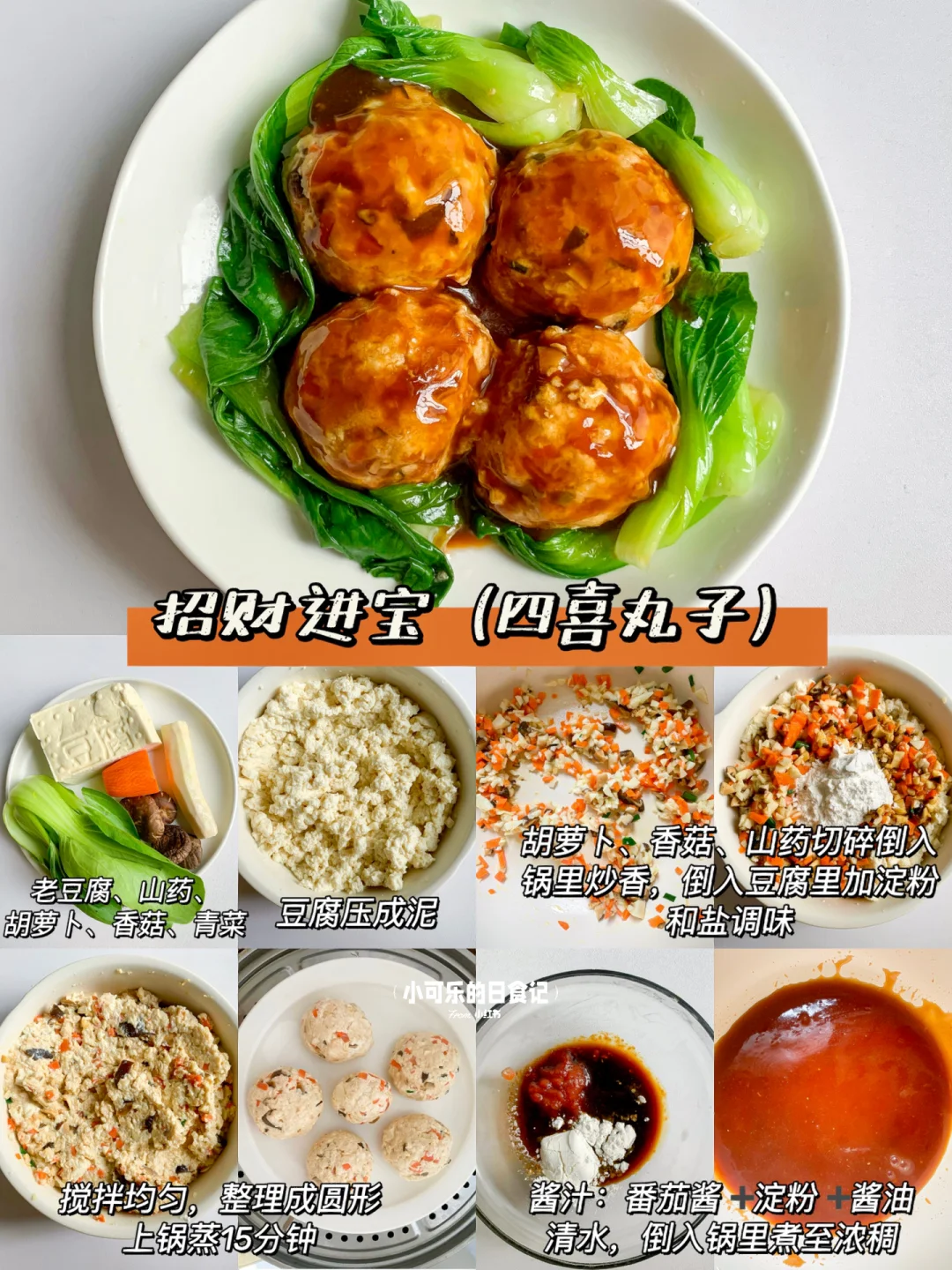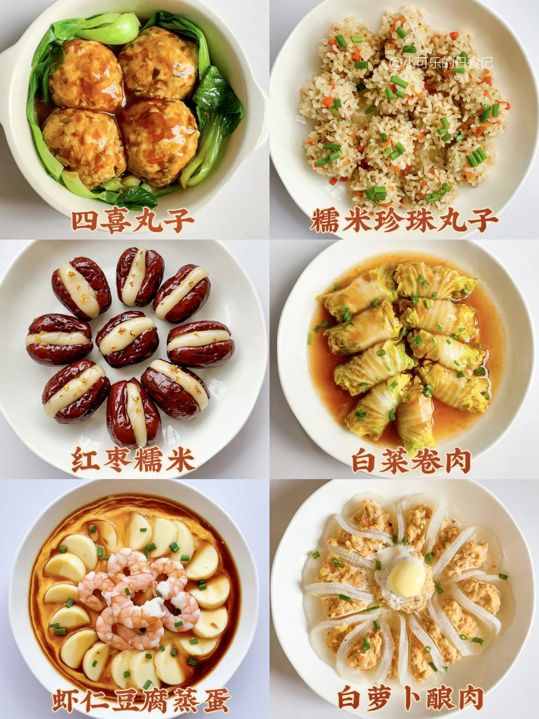 新年快乐呀,今天为大家准备了年夜饭菜谱🧧六道上桌好看又好吃的家常菜,简单易做,赶快学起来,和家人一起吃团圆饭啦 - 年夜饭菜谱📝 招财进宝(四喜丸子) 团团圆圆(糯米珍珠丸子) 笑口常开(红枣糯米) 招财纳福(白菜卷肉) 蒸蒸日上(虾仁豆腐蒸蛋) 花开富贵(白萝卜酿肉) - 🧨详细做法请看图片