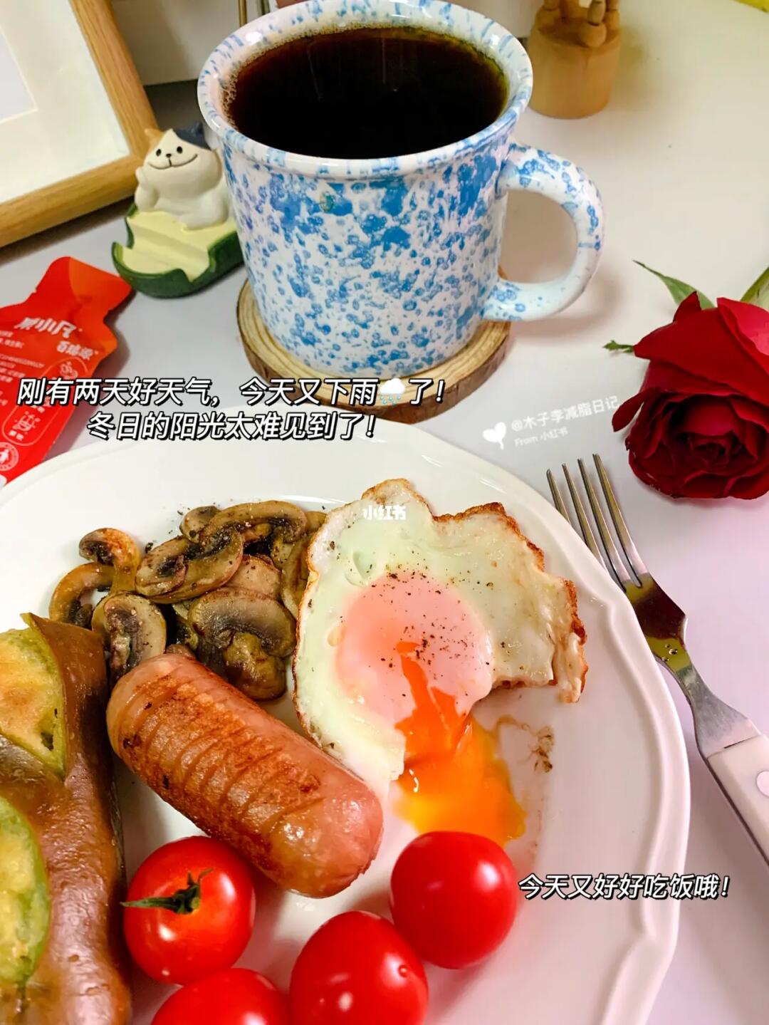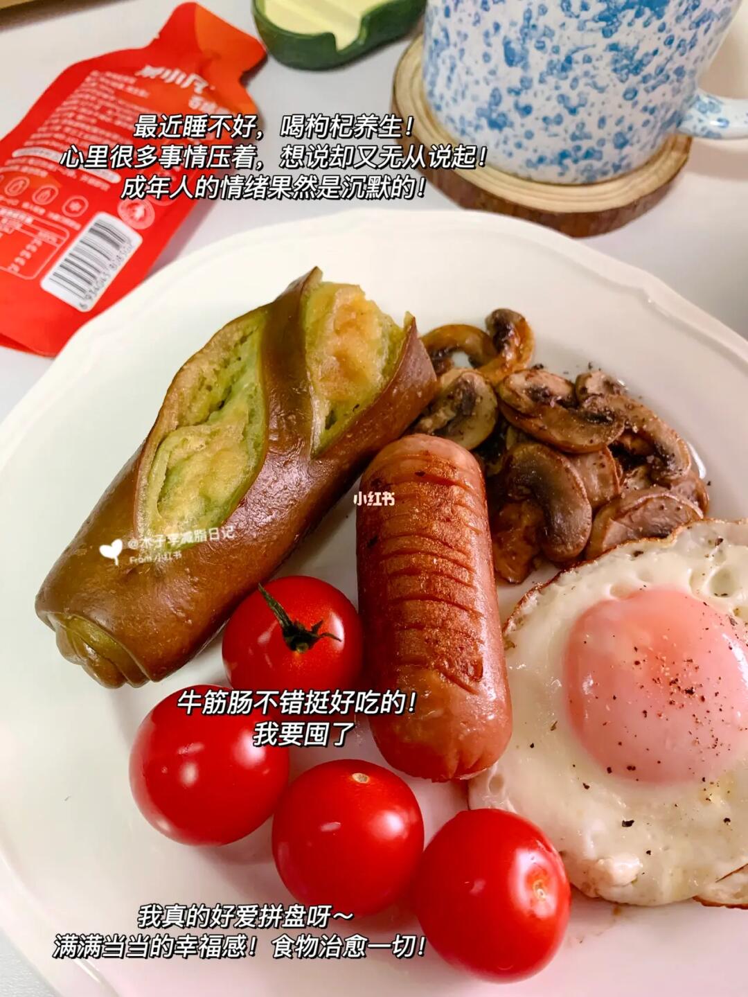 🍳早餐:煎蛋|枸杞原浆|千禧果|口蘑|抹茶奶酥碱水|牛筋肠|黑咖啡