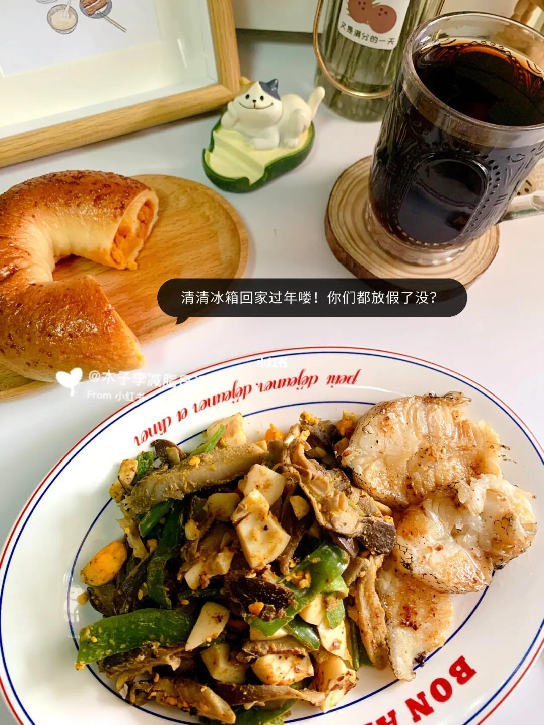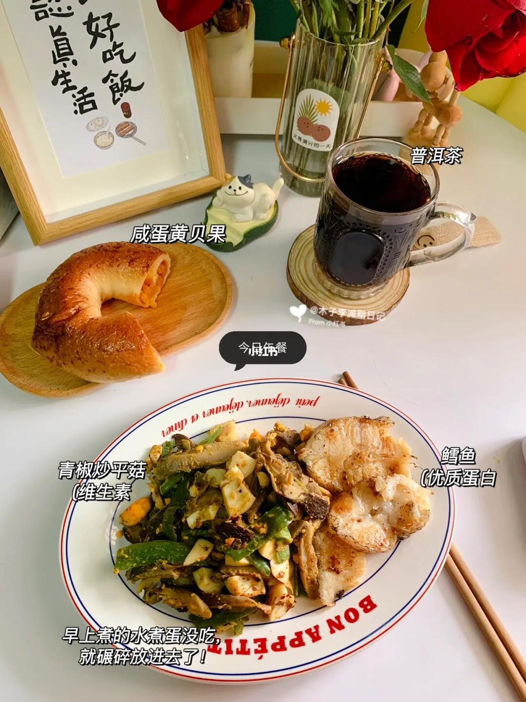 🥙午餐:青椒炒平菇|煎鳕鱼|咸蛋黄贝果|普洱茶